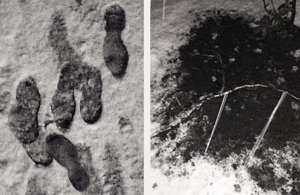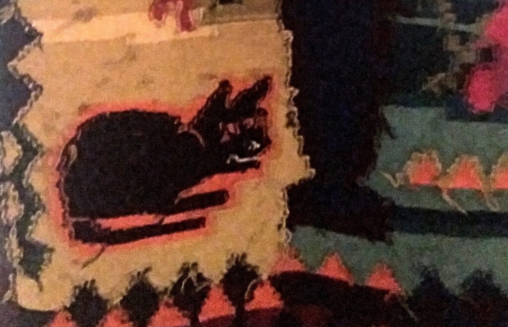 Heute von meiner Seite: Der Schnee im Kleinen Tiergarten mit seinen feinen Tierspuren und im Kontrast dazu die tiefdunklen groben Abdrücke in unserem Hof, der leichte, wach machende Regenwind, die Katzenfäden auf der Rückseite des von Lise Gujer gewebten Teppichs.