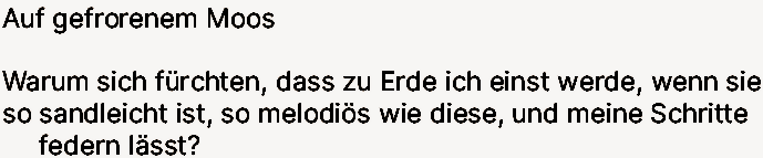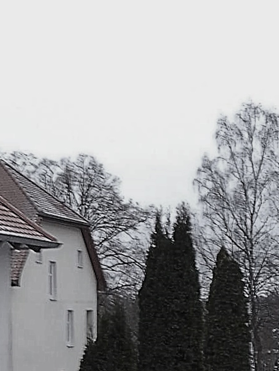Hohe, schmale Wolken in zartem Blau ziehen vorüber. Die Festbeleuchtung der Kirche ist ausgeschaltet, der Kindergarten nach der Feiertagspause wieder geöffnet. Die Elternautos mit Rauchfähnchen auf dem Parkplatz; ein Paar steigt aus, die Mutter geht voran, der Vater (Vermutung) orientiert sich, sichert nach hinten ab. Also neu hier. Der Tag hat sich noch nicht entschieden, den Frost abzuschütteln.