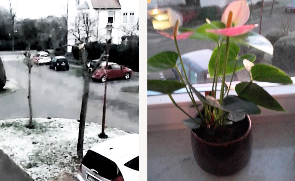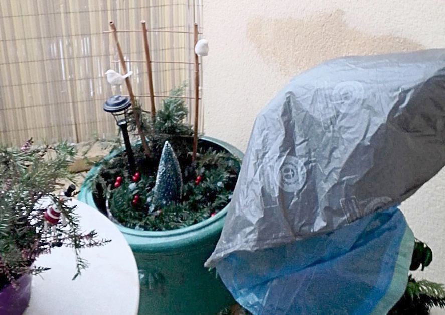 Der erste Schnee des Jahres! Unter dem Müllsack verbirgt sich eine Dipladenie, die soll keinen Frost abbekommen. Hoffentlich nicht! Im Sommer ist sie wunderschön.