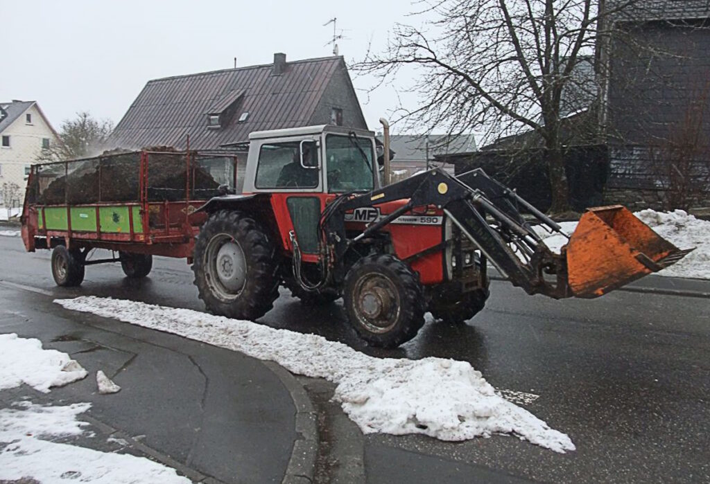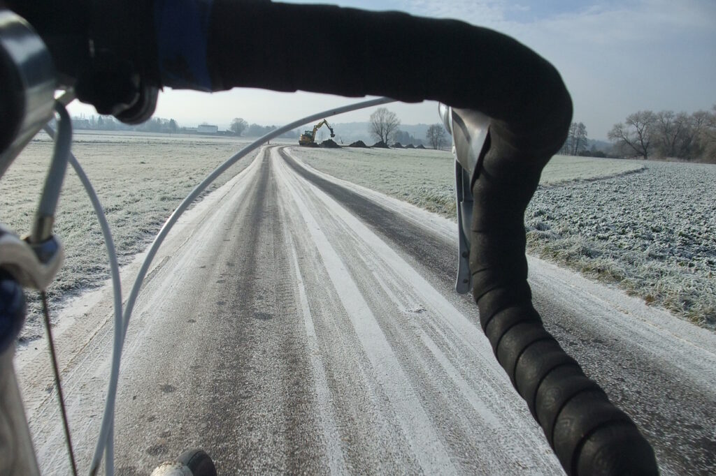 Habe 90 Minuten genutzt, um zwischen rosig-bleiernen Wolken eine feine Hausrunde über die Schneegrenze zu drehen. Ab 350 Metern bleibt er liegen, so kann es bleiben. Steifer Nordwest, die Windräder scheinen auf Halten gestellt, es gibt gerade zuviel Strom im System. Die Luft tief und klar. Ein paar abgelegene Dörfer am Vulkanhang, die Sonne sei ihnen gegönnt. Auf der Schattenseite machen die Straßen es nicht lange: Frost und Tau lassen sie schnell schrundig werden, die Salzung tut ihr Übriges. Es sind oft die hübschesten Strecken.