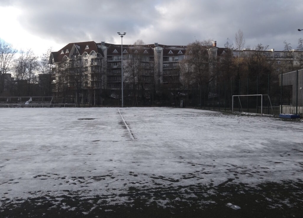 Was mich bei diesem Ausflug nach Charlottenburg dann wirklich berührte, war der unfassbar traurige Anblick des schneevereisten, menschenleeren Kunstrasenplatzes in der Fritschestraße, nicht einmal Vögel waren zu sehen oder zu hören. Trostlos pfiff der Wind durchs netzlose Tor. Trüber als Nacht will uns der Tag erscheinen.