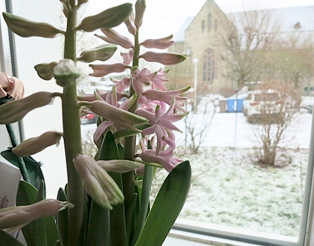 Ein passabler Morgen. Der Duft der Hyazinthe hat den Raum im Griff. Morgen wird es Zeit für einen Nachfolger, die erste Blüte neigt sich schon in die Waage. Die Rhythmusänderung zum 6-Uhr-Takt nach den Ferien steckt allen in den Knochen, hell wirds erst gegen 8.