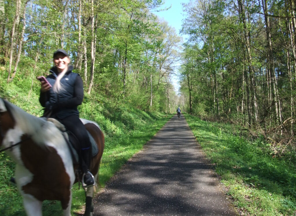 An der Motorradsperre liegt ein Flummi mit dem Winnieh Puh Tiger. Der sprang doch auch immer auf seinem Schwanz durch die Welt? Ich begegne niemandem und kann die Schleppleine an Emma ausprobiern. Eher muss ich mich daran gewöhnen. Geht ganz gut.