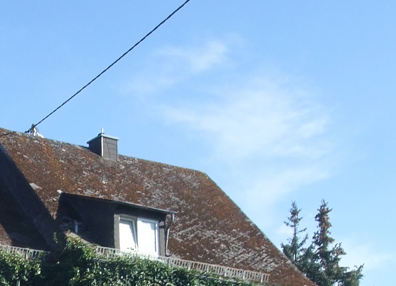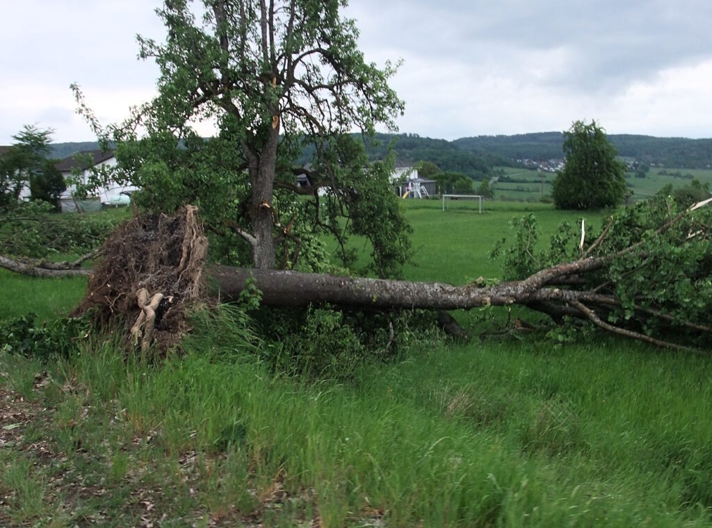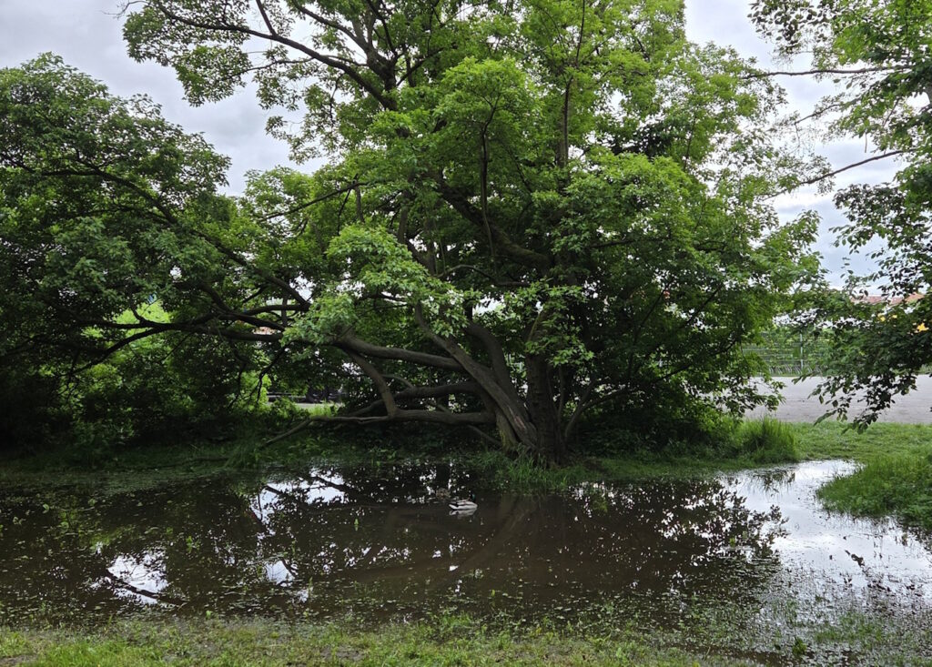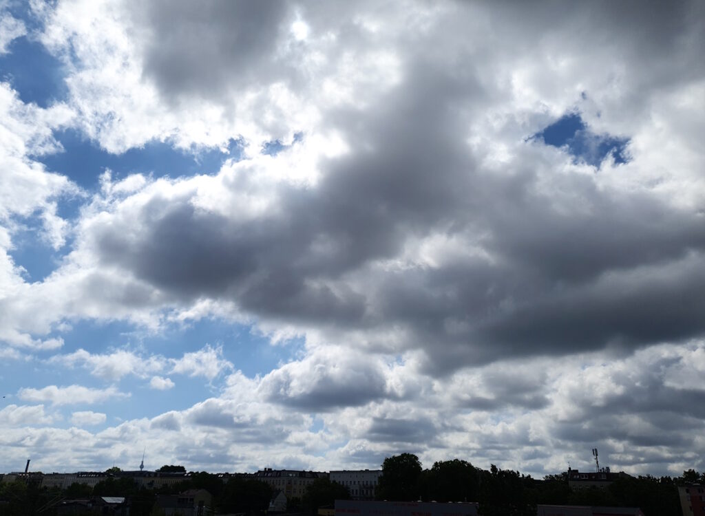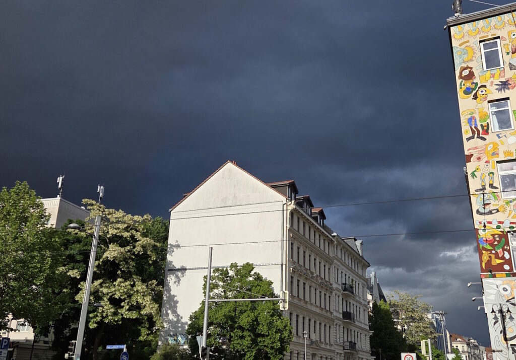 Am Spätnachmittag wär ich dann fast von der Sonne in die Traufe gekommen: Ein viertelstündiger Guss mit fernem Grollen. Angesichts der schwarzen Wetterwand drehe ich aber vorsichtshalber bei und sichere den Bereich um unser Haus. Zehn Minuten nachdem alles unter Dach und Fach ist, geht der Zauber auch bei uns los: Heftiger Wolkenbruch, die Temperatur fällt um 12 Grad, Böen peischen die Bäume … Genau zu der Zeit ist der Sohn unterwegs! Später berichtet er, dass sein Auto so heftig aus der Spur geschoben wurde, dass er sich lieber in Sicherheit brachte und auf einen Rastplatz fuhr.