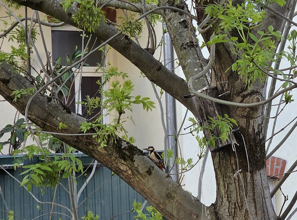 Der eine liebt ihn, der andere fürchtet ihn. Waldbesitzer schätzen seine Arbeit. Eigentümer von modernen, mit Styropor gedämmten Häusern versuchen, ihn mit Flitterkram und Raubvogelimitationen zu verjagen. Wenn ich morgens mein Fahrrad in den Innenhof unseres Bürogebäudes schiebe, höre ich ihn manchmal. Heute früh, mit den Augen auf eine Bewegung reagierend, sehe ich ihn dann auch auf einem Ast vor meinem Fenster: Den Buntspecht. Oder wie man in meiner alten Heimat Norddeutschland sagt: Boomhacker.