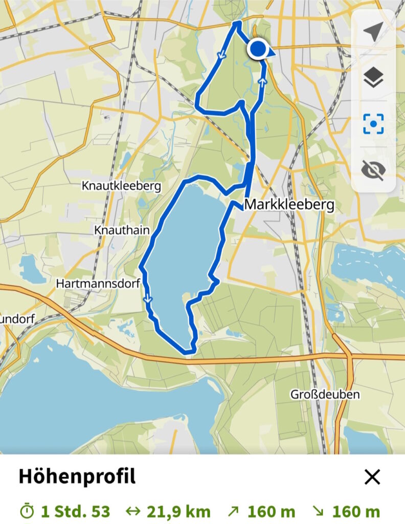 Nach der Arbeit wollte ich mich einfach austoben. Und laufen wollte ich sicherheitshalber nicht, weil mir gestern nach dem Training mit den Kids etwas das Knie geschmerzt hat. Also rauf aufs Gravelbike. Die Seentour war mein Plan: Markkleeberger und Störmtaler See umrunden, etwa 50 Kilometer.