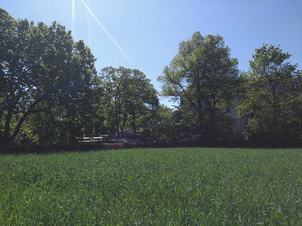 Ich gehe einmal die komplette Bernauer herunter. Im Mauerpark seh ich eine Frau mit dem coolen Glitzeraufnäher „I LOVE MOSCHINO“. Am Vinetaplatz blüht duftend Flieder. Touristenhorden überlaufen die Mauergedenkstätte. Wo einst Menschen starben, macht man heute dümmliche Posefotos. Aber besser Selfiegrinser als Soldaten mit MPs, Selbstschussanlagen und auf Menschenjagd zugerichtete Hunde. Ich schaue mir das Areal hinter der Kapelle der Versöhnung an. Ein Stück der sogenannten Hinterlandsicherungsmauer steht noch. Im Ex-Niemandsland befindet sich der Gemeinschaftsgarten „NiemandsLand“, ein Projekt zweier Kirchgemeinden. Blühwiese, Pflanzenkübel, Kräuterwildwuchs – alles angenehmunordentlich.