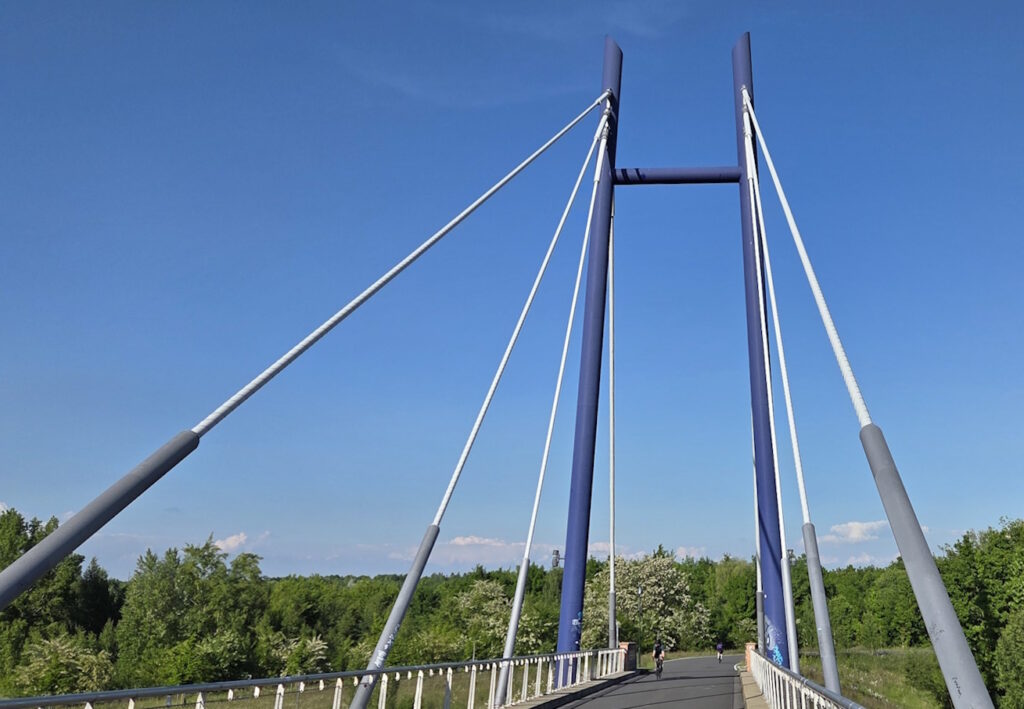 Weiter geht es nach Gaschwitz. Ich hätte Appetit auf etwas Kleines, aber der Radlerhof ist noch geschlossen. Weiter geht es über die filigrane Neuseenbrücke, unter welcher die B2 verläuft. Südlich des Markkleeberger Sees will ich an der stillgelegten Schleuse zum Störmthaler See, aber das Teilstück ist ebenfalls gesperrt. Es gibt eine Umleitung für Radfahrer.