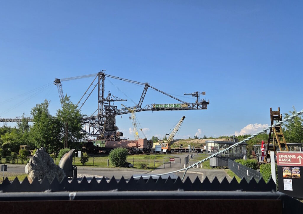 Ich fahre also die Umleitung, überquere die A38 und komme am Bergbau Technik Park vorbei. Den alten Abraumabsetzer des Tagebaus Espenhain (ca. 2400 t, Baujahr 1985, bis zu 10.000 m³ Förderleistung) sieht man bereits aus großer Ferne, aber so nah war ich ihm noch nie. Dann bin ich endlich am Störmthaler See. Hier ist Schluss mit Wanderern, Joggern und Skatern. Es gibt nur noch Rennfahrer, einige weniger Pendler und ein paar mittelschnelle Radfahrer wie mich.