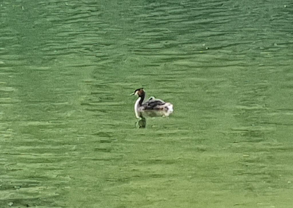 Der Freitag ist ein großer Tag in meiner kleinen Schlachtenseebucht: Der Nachwuchs des Haubentaucherpärchens, das ich seit Mitte April im Vorbeischwimmen beim Nestbau und Brüten beobachtet hatte, ist nun geschlüpft! Weil die Küken in den ersten Lebenswochen noch nicht ihre Körpertemperatur regulieren können, suchen sie Schutz zwischen den Flügeln der Eltern – eine Art natürlicher Brutkasten. Von dort aus lernen sie dann nach und nach die Umgebung kennen und rutschen dabei immer wieder kurz ins Wasser, um Schwimmen zu üben. Zum Ausruhen kehren sie auf die Erzeugerrücken zurück, wo sie zudem besser vor Raubvögeln und -fischen geschützt sind. Praktischerweise werden sie vor Ort auch gleich gefüttert – das Gerangel um den besten Fressplatz, inklusive Runtergeschubse der Geschwister, ist jedes Jahr ein großartiges und herzerwärmendes Schauspiel – das hat die Natur doch alles äußerst klug eingerichtet.