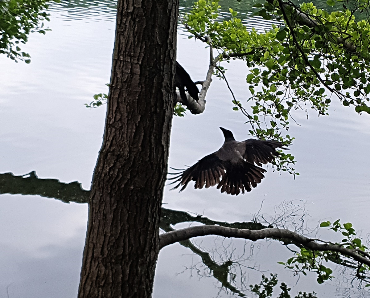 Nach dem Baden schaue ich zwei deutlich agileren Verwandten des maladen Hofhähers bei ihren Kurzflügen, beim Hopsen, Hüpfen und Geflatter zu: Nebelkrähen in Aktion. Faszinierend. Immerzu so viel los – man kommt gar nicht hinterher mit dem Sehen, Hören, Staunen.