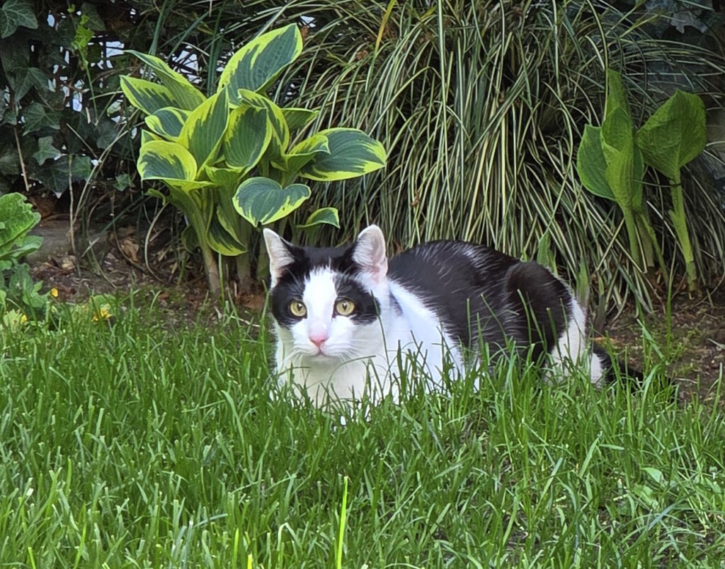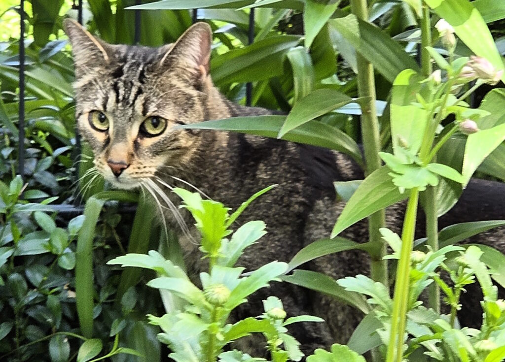Der Ruf der Natur: Unsere beiden Kater sind eigentlich Stubentiger. Aber jetzt zieht es sie mit aller Macht raus in den kleinen Garten. Lauern, anpirschen, nach fliegenden Insekten haschen. Optisch ist der getigerte Kater im Vorteil – versteckt er sich im Dickicht der Blumen und Büsche ist er auch von uns kaum zu entdecken. Der schwarzweiße ist auffälliger, aber genauso ein geduldiger Jäger.