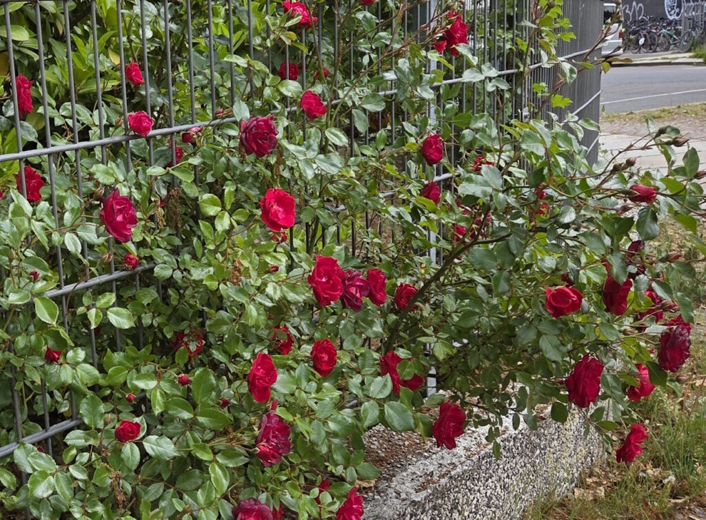 Da nur wenig Verkehr ist, habe ich mehr Augen für die Umgebung. Eine Rose, die ihre Fesseln sprengt und weit über den Zaun hinaus wuchert, begeistert mich. Vielleicht sollten wir stärker der Natur vertrauen.