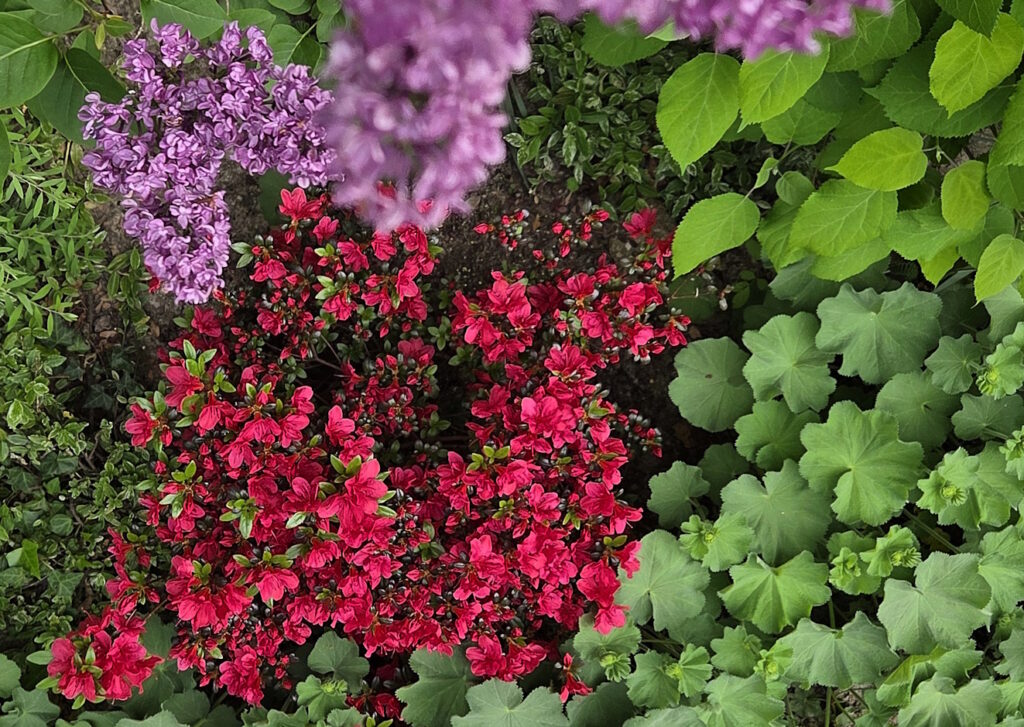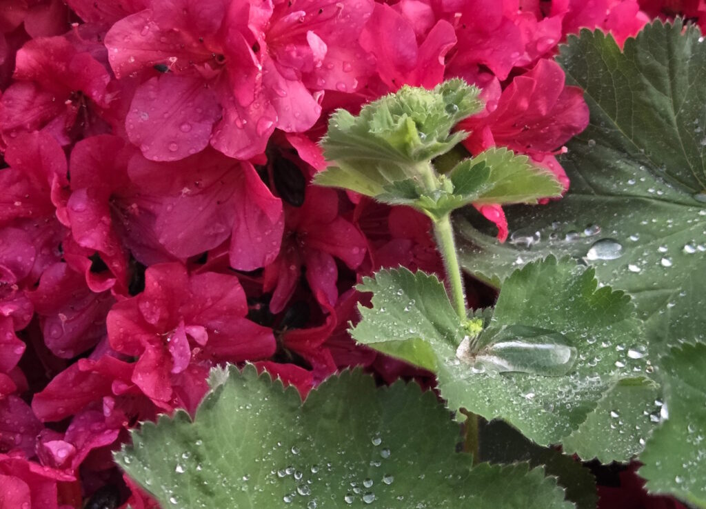 Ich muss noch eine Runde gehen. Unsere Azalee ist in voller Blüte. Der Vorgarten hat seinen eigenen Charme mit den Wassertropfen. Wenigstens regnet es momentan nicht.