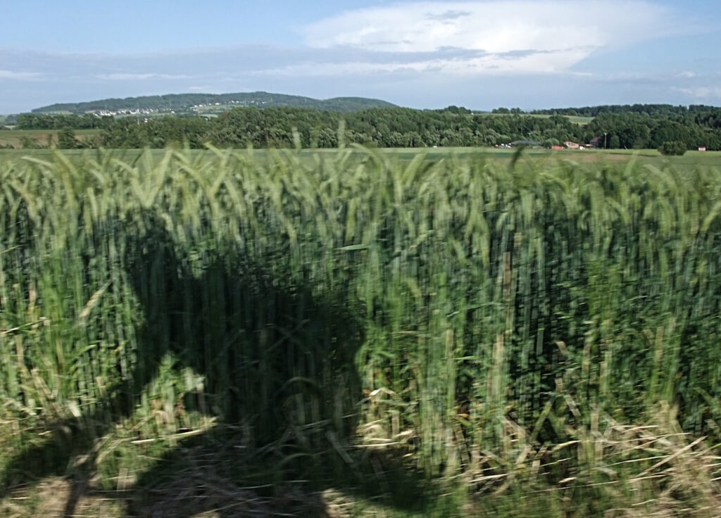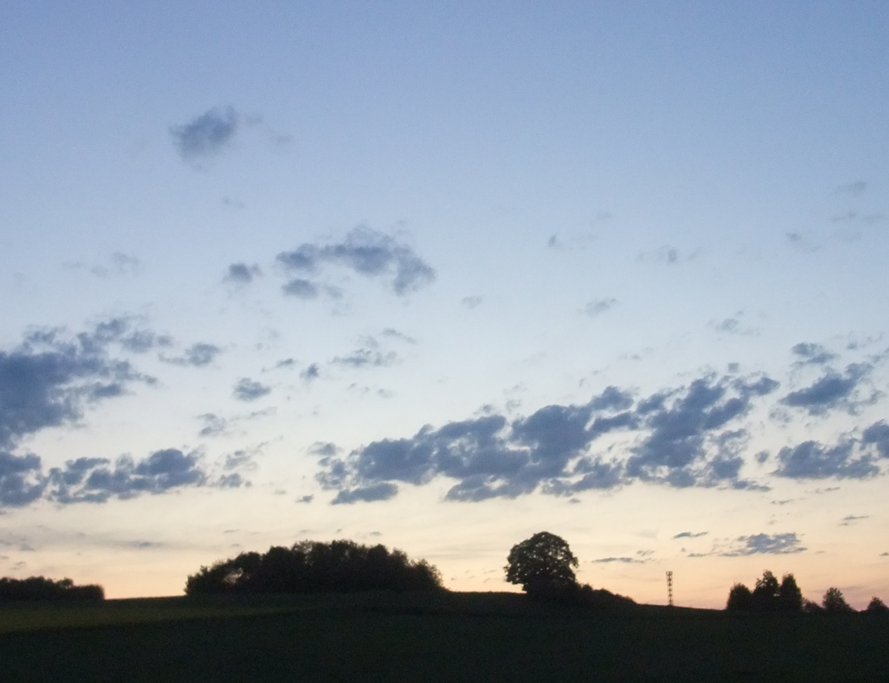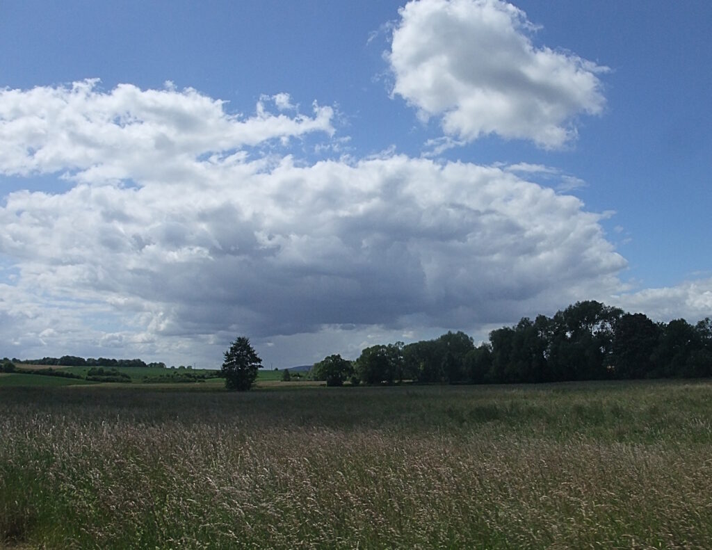 Gegen Mittag zieht ein Gewitter vorbei: dramatische Wettermauern aus dunkelstem Schiefer. Danach immer neue Ballungen und Wände in allen Schattierungen von Grau. Weiße Wolken sind langweilig. Gerste, Roggen und Weizen stehen bombig am Halm, sie haben in zwei Tagen sicher 10 cm zugelegt. Die Ernte wird genau jetzt, in diesen Tagen, entschieden. Blaugrün schimmernde Horizonte, die Wildrosen als blasse Sterne am Wegrand.