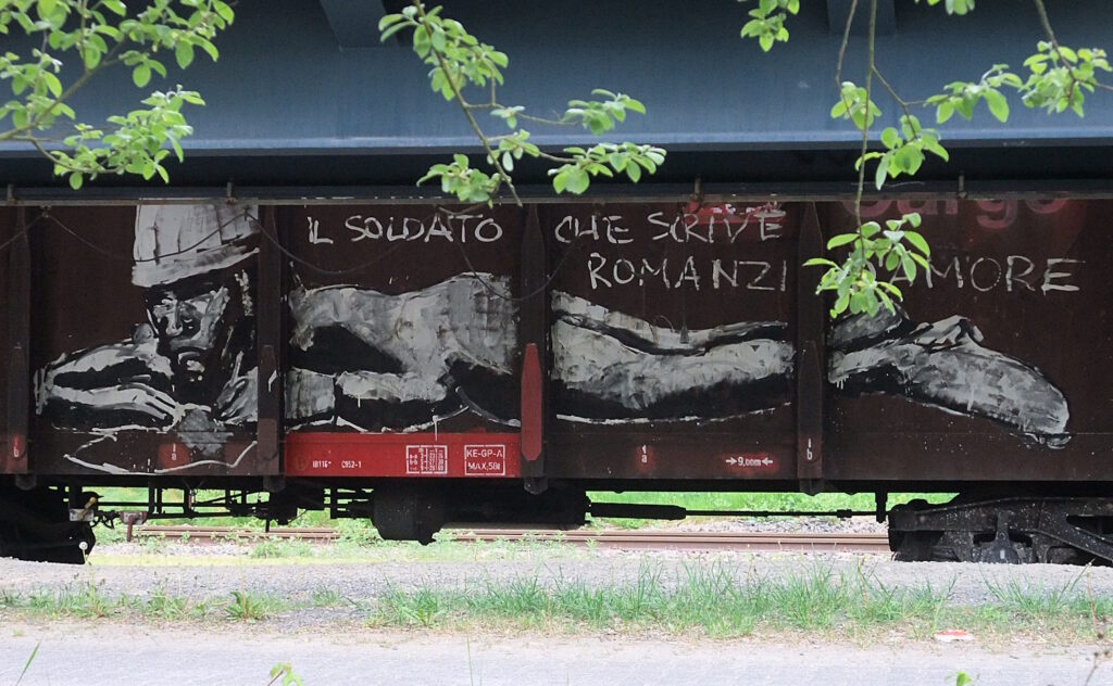 Für alle Bolognese gekocht. Dann aus Bradburys „Marschroniken“ vorgelesen – die Jüngste fands witzig. Weiter mit Musik und Text. Nach einer Dreiviertelstunde ergebnisarmen Gefrickels am alten, festgefressenen Zahnkranz und einer Hinterradbremse entkrampfe ich, während das Teewasser heizt, meinen Rücken. Mit Pai Mu Tan die Radionachrichten. Dann aufs Rad. Ich bekomme beim Trödler einfache Manschettenknöpfe aus vernickeltem Metall. Am Zug, der den Steinefrenzer Ton Richtung Sassuolo bringt, ein neues Graffiti: „Der Soldat, der Liebesromane schreibt.“ Ich stelle mir immer vor, dass das einer dieser ausgemergelten, aus dem Kloster entronnenen Mönche sprayt, die an großen Häfen und Bahnhöfen herumlungern.