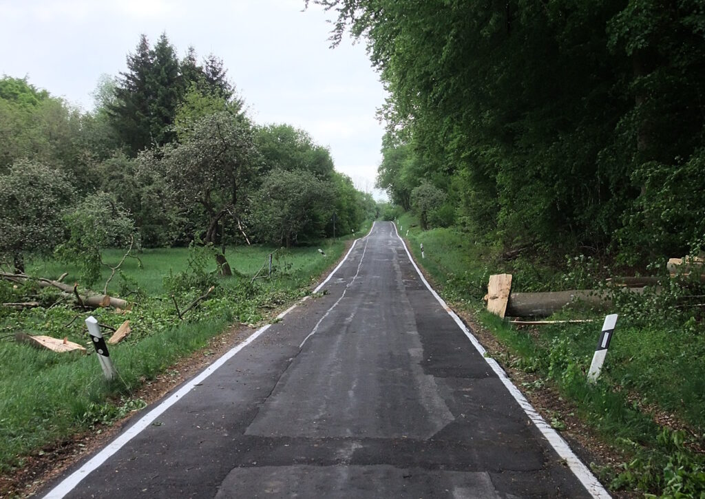 Wie richtig es war, gestern umzukehren, sehe ich dann heute: Drei Kilometer nördlich von uns haben die Orkanböen auf einem Korridor von etwa fünfhundert Metern Bäume aus der Erde gerupft und quer über die Wege gelegt. Auffällig, wie schmal die Schneise ist: Davor und danach nur Astbruch, in der Todeszone gefallene dreißigjährige Eichen oder Buchen – selbst mitten im Wald, wo sie einfach in der Mitte auseinandergebrochen sind. Da einige Siedlungen komplett von der Außenwelt abgeschnitten wären, machen sich zupackende Gartenbauer mit mächtigen Traktoren an die Arbeit und räumen alles beiseite. Man stelle sich vor, wie in Hannover oder Göttingen auf die Genemigung eines Sonderauftrags gewartet werden müsste …