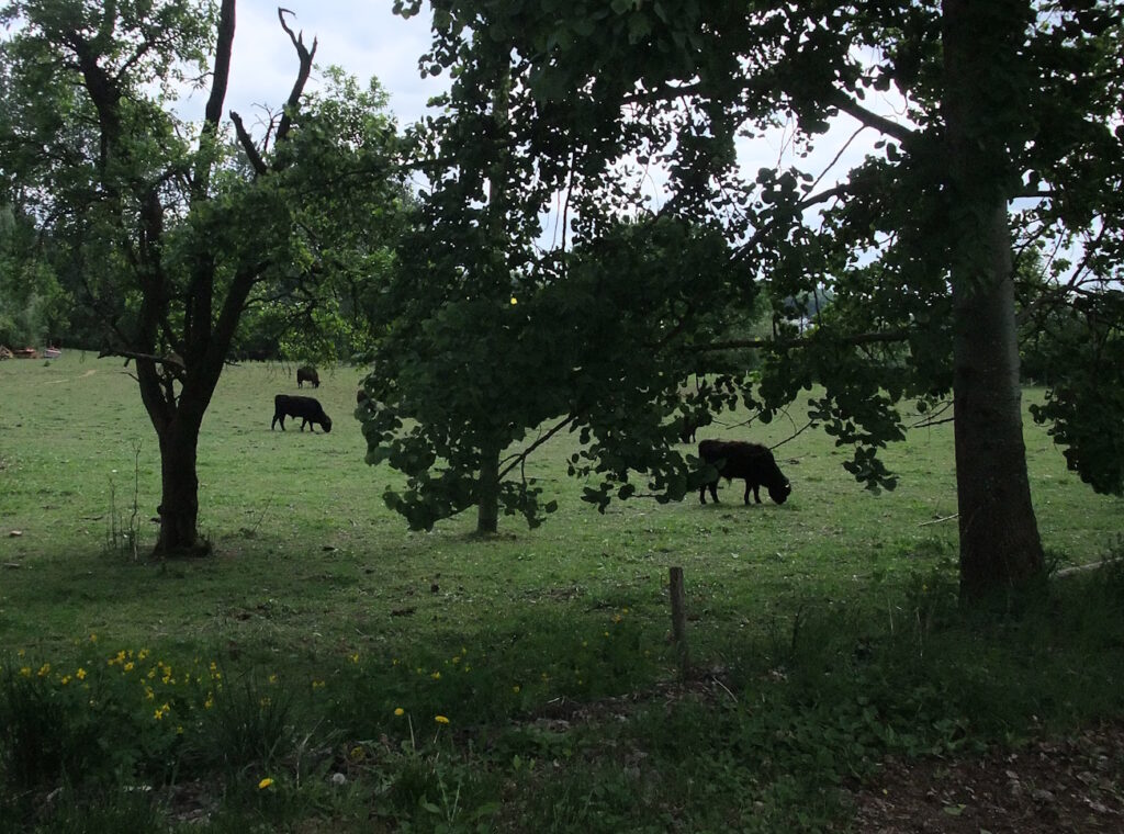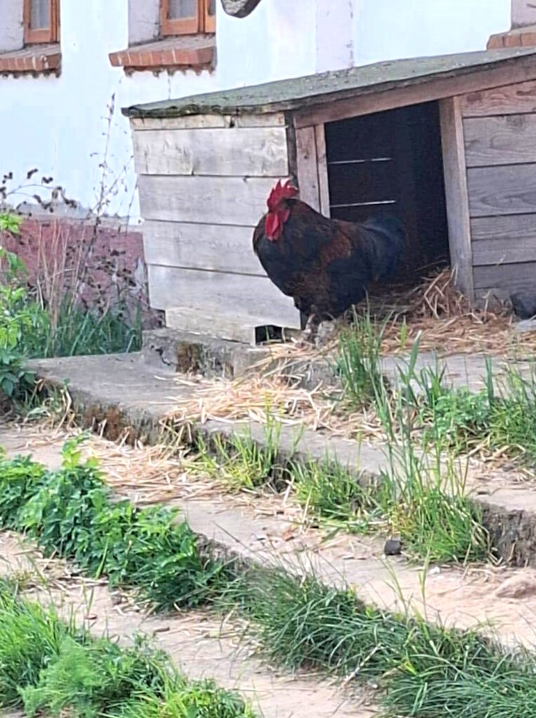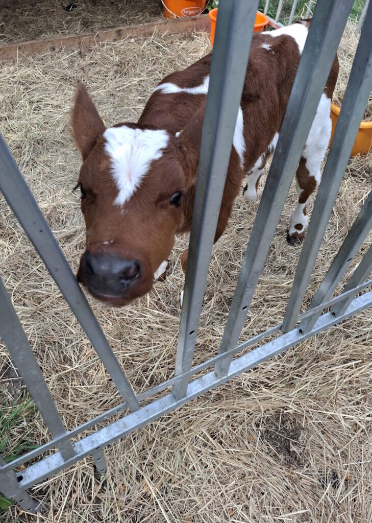 Auf dem Hof ist alles bio! Die Tiere haben viel Platz, ob im Stall oder draußen, wo sie frei herumlaufen oder -flattern. Das Kälbchen war noch ziemlich wacklig, da es gerade auf die Welt gekommen ist -während die Mutter gemütlich vor dem Haupthaus lang spazierte.