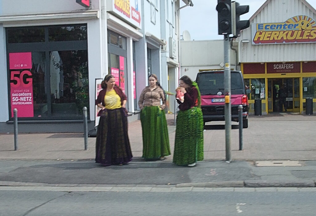 Am Samstag 180 Kilometer übers Rothaargebirge und Gladenbacher Bergland, Zwischenhalt in Gießen. Unter immer dichter werdenden Wolkenbänken fahre ich acht Stunden dem Regen davon, auf den letzten 10 Kilometern fängt er mich ein. Ein reicher Tag in der tiefen, bunten Mitte Deutschlands mit einer wundervollen Vegetation und viel, viel Merkwürdigem. Zum Beispiel einem bizarren Frauentrio vor dem Herkules-E-Center in Haigar – keine Ahnung, ob sowas unter Folklore läuft oder nicht. Obwohl man hier nie reich war, ernüchtert mich der Zustand der kleinen Dörfer und Städte im Lahn-Dill-Kreis.