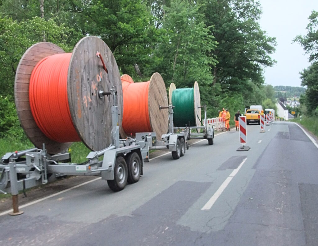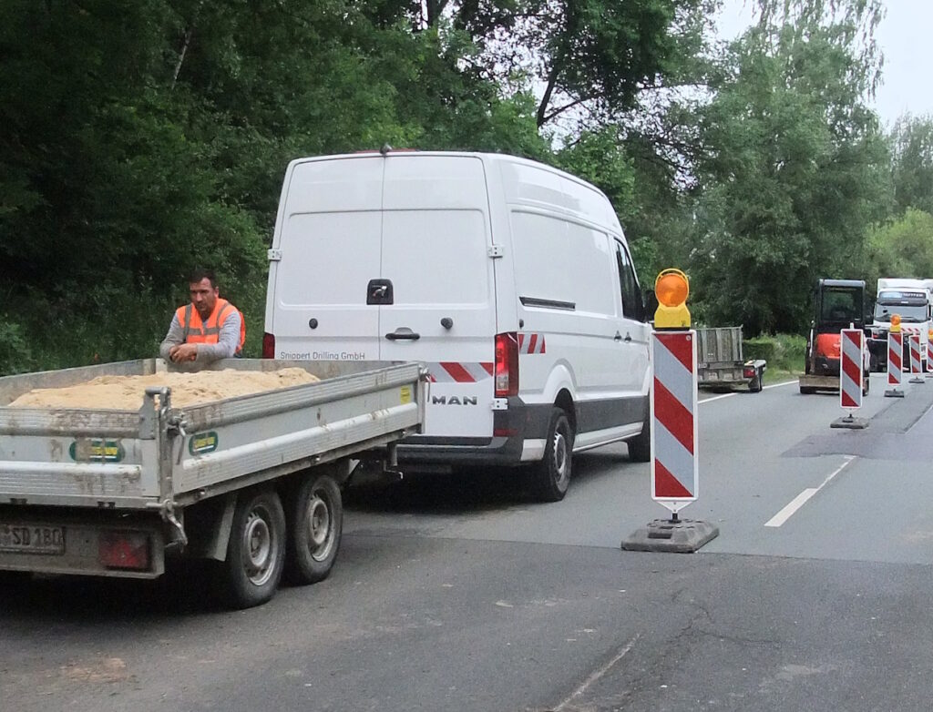 Die Kolonnen mit dem Glasfaserkabelbohrer kommen voran. Sind um 19 Uhr noch bei der Sache. Hören erst auf, wenn der Netto schließt oder das Tageslicht fort ist. Ein Tankwagen versorgt die Maschine mit Spülwasser für den Kabeltunnel.