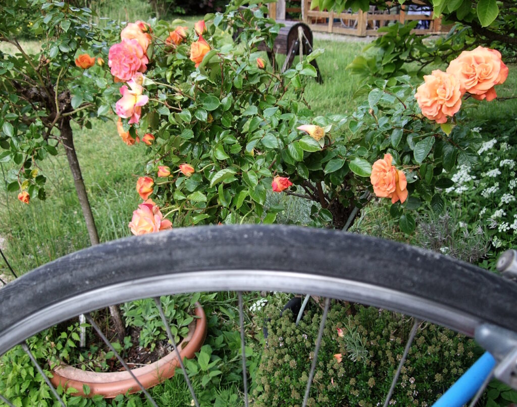 Am Sonntag Regeneration – 180 Kilometer sind schon ein Batzen, aber ein guter. Trotzdem wollen einige harte Anstiege verarbeitet werden. Blick auf den feuchten Garten, es regnet seit zehn Stunden leicht und beständig. Die ersten wilden Erdbeeren sind reif. Tauben liefern sich von den Dächern her ein Wettrufen.