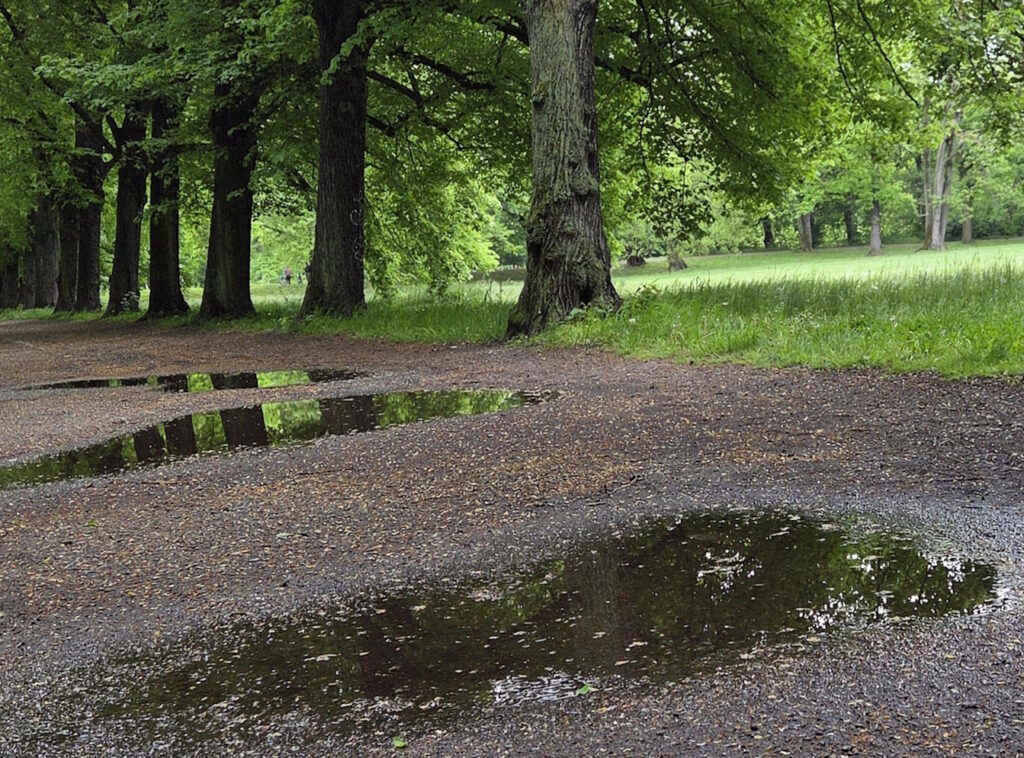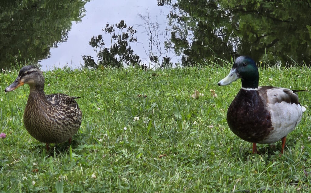 Kurz vor Ende werde ich auf Höhe der Pferderennbahn doch noch belohnt. Nach dem Motto, Platz ist in der kleinsten Pfütze, hat es sich ein Entenpärchen an einer Stelle gemütlich gemacht, wo sonst nur Gras wächst. Tatsächlich gibt es hier eine Senke mit lehmigem Untergrund, in der das Wasser oft lange stehen bleibt. Für Liebhaber von Spiegelungen auf Regenwasser – oder Joggern – ein echter Hingucker.