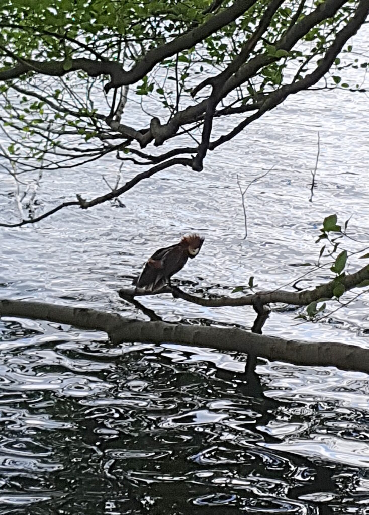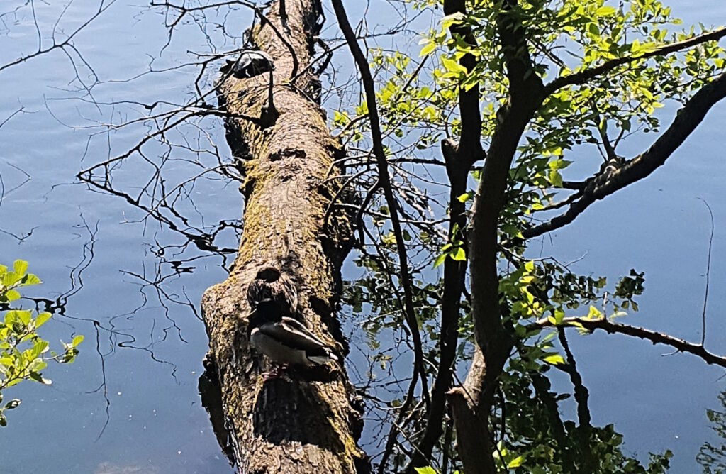 Am im und unterm Wasser liegenden Baum, auf dem, wie bei diesem Sonnenstand üblich, diverse Vögel und teils exotische Schildkröten sitzen, komme ich wie immer mit jemandem ins Gespräch. Man redet dort naheliegenderweise über Bauchfarben und Panzerformen und vergleicht diese mit jenen, die man mal irgendwo im Urlaub gesehen hat. Welche importierten und später ausgesetzten Arten da neben der einhemischen Sumpfschildkröte den Kopf herausstrecken, ließ sich aber bislang noch nicht verifizieren. Circa zweihundert Meter weiter badet ein Mann, dessen Hund auf einem Schwimmbrettchen vor ihm hertreibt – ein Jogger und ich rufen ihm die Surfscherze zu, die er wohl von allen Vorbeikommenden hören wird. Ein Graureiher besorgt sich aus einem von Mäusen besetzten Hohlbaum Fressen, seine Pick- und Schlucktechnik sind in ihrer Effektivität faszinierend.