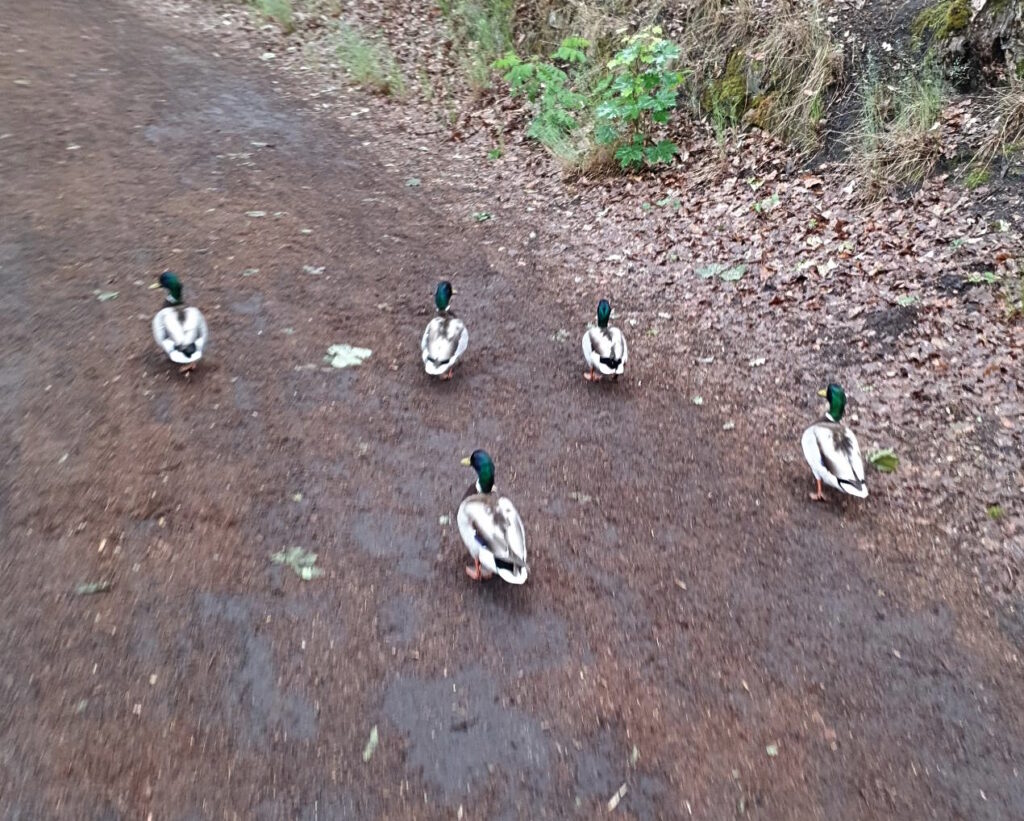 Morgens im Starkregen geschwommen. Um mich herum Enten. Auch zwei Exemplare der Art, die ich noch nicht identizifieren konnte. (Die AI-Robots und Vogelportale ebenso ratlos. Vielleicht Nachkommen der „Albinoente vom Schlachtensee“?) Die Bodenfeuchtigkeit deckt das Buffet neu – fünf Stockentenmännchen machen sich hurtig auf die Suche nach ihrer liebsten Proteinquelle. Mein An- und Ausziehen geht routiniert vonstatten, man muss nur in der Modder einbeinig das Gleichgewicht halten können. Trotz des Wetters einige Jogger und Gassigeher unterwegs. Eine mir unbekannte Hundeausführlady wünscht äußerst nett einen „Guten Morgen!“ Den wünsch ich ihr auch. Mal sehen, ob wir uns ohne Kapuze wiedererkennen werden.