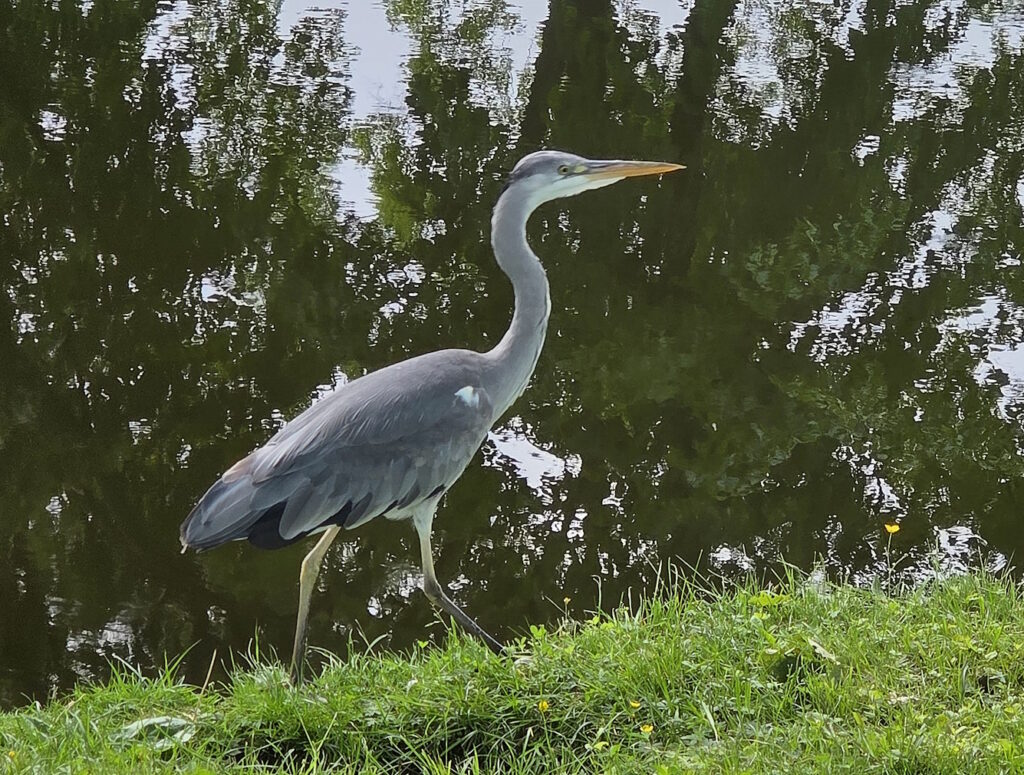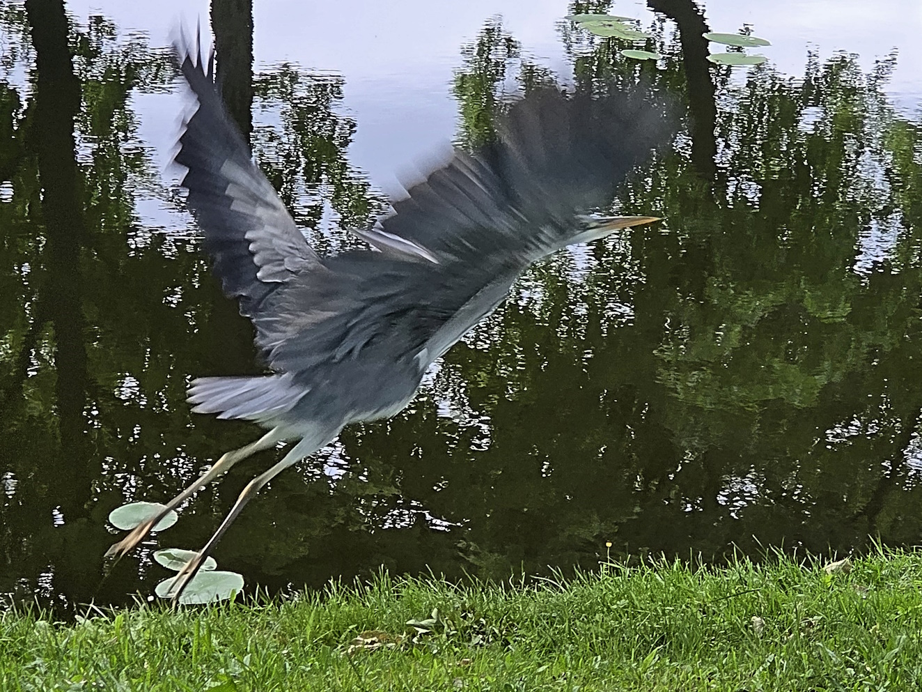 Ein Entenpärchen watschelt uns bis vor die Füße, zieht aber weiter, da wir offensichtlich keine Brotreste dabeihaben. Überall entdecken wir Reiher. Auf den Brüstungen, am Seeufer oder am künstlichen Kanal des Schlossparks. Ich will einen im Flug fotografieren. Der erste wird von einem Hund aufgescheucht – zu spät für mich. Dem zweiten komme ich so nahe, bis er sich belästigt fühlt und auch tatsächlich abhebt. Nur leider ist ein Smartphone, was Actionfotos betrifft, dann doch limitiert.