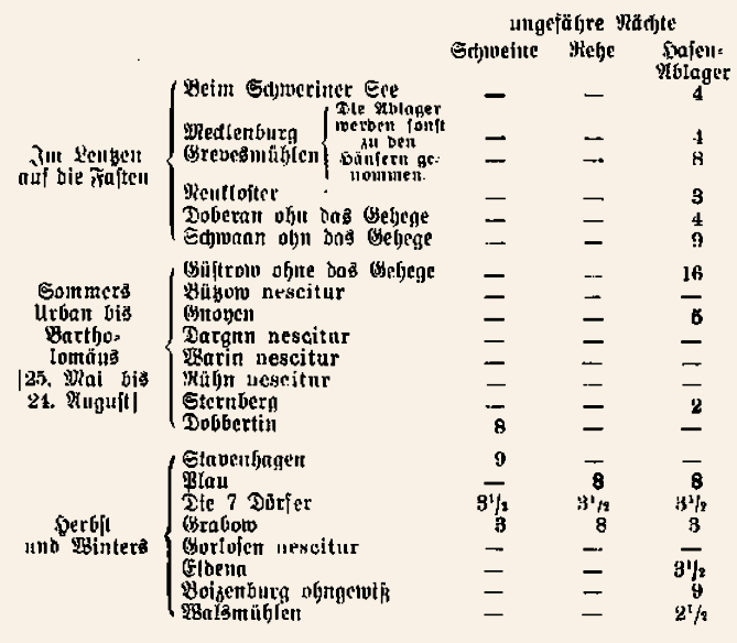 Kommen wir zunächst zu den Hudewäldern, also den Wäldern, die zur Viehhaltung genutzt wurden. Als es die Stallfütterung noch nicht gab, wurden das Vieh teilweise in den Wald getrieben, insbesondere zur Herbstzeit die Schweine, die vor allem Eicheln und Bucheckern fraßen. Diese „Feistung“ betrug etwa 70 Tage, jedes Tier verzehrte täglich ungefähr 16 Liter Bucheckern oder 12 Liter Eicheln. In den Unterlagen sind Mastschweine recht oft erwähnt, so schrieb zum Beispiel der Pastor aus Lancken: „Noch habe auf hiesigem Felde eine Pfarrhöltzung, daraus mein nothdürftiges Brennholtz und freye Mast, so viel Schweine darinnen fett gemacht werden können, bey voller Eichenmast 12, bey voller Buchenmast aber, welches doch selten ist, woll 29 a 30 Stück.“ Ähnliches wird aus Grebbin berichtet: „Wenn Mastung ist, soll der Pastor ins Grabauer Holtz 6 Schweine frey jagen.“ Nicht nur dem Pfarrer, sondern auch anderen Berufen stand das Recht der Hude zu; dazu vermeldete der Pastor aus Lübz: „Der Rector Scholae, der Organist, so auch Schulcollega, die beyden Vorsteher item ein jeder ein Mastschwein.“ In dem Zusammenhang werden auch Berufe mitgeteilt: Kuhhirte, Schweinehirtsche und Schäfer gibt es fast in jedem Dorf; aber auch in mancher Stadt, z.B. in Lübz eine Gänsehirtin. Wobei die letzten beiden natürlich nicht im Wald hüteten. Gefahrlos muss das alles nicht gewesen sein, denn zu jener Zeit kamen noch Wölfe in der beschriebenen Gegend vor.