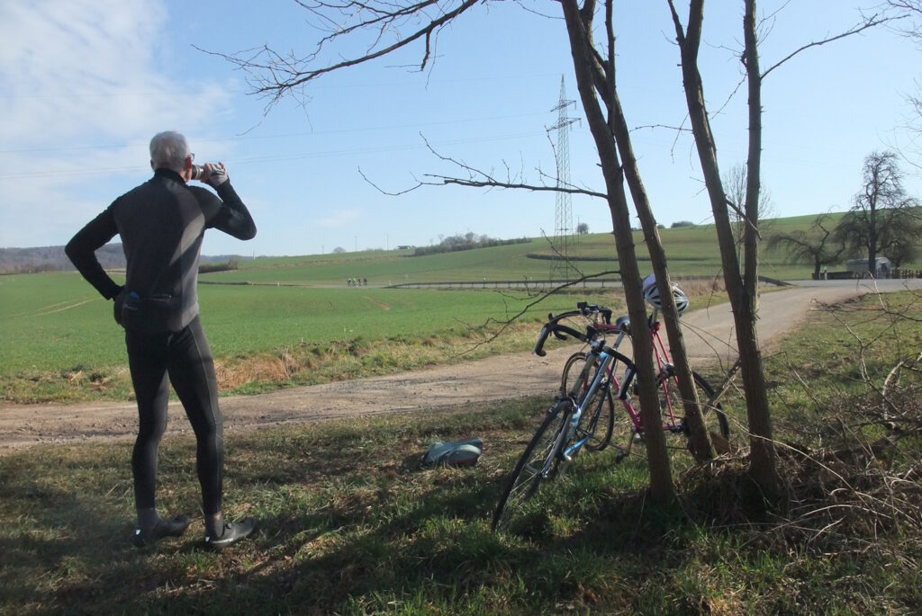 Neue Töne aus den Büschen, Taubengurren aus allen Richtungen. Ein guter Morgen für einen ausgeschlafenen Radfahrer. Ich fühle mich frisch wie die Veilchen, die gerade aus der Erde kommen. Alles macht einen Schub da draußen. Seit Freitag umkreisen Turmfalken den Kirchturm, der Kampf um die Plätze ist noch nicht entschieden. Es dürften Bruderkämpfe sein. Die Krähen haben jetzt weniger zu lachen, ihre kreuzförmige Sonnenliege ganz oben ist ein unruhiger Ort geworden. Gebe dem Sohn noch letzte Ratschläge und ein I-Pad für die Schwester in die Schule mit. Die Märzsonne ruft!