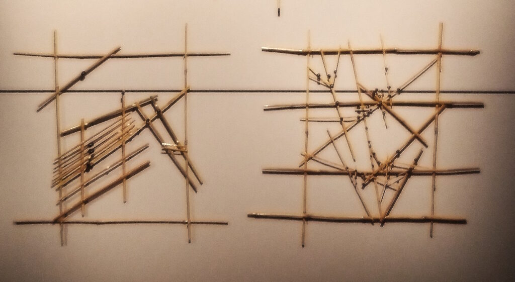 Die von Sternenbildern, Kalendern und Jagdkarten ihrer Vorfahren inspirierten Bambusbilder der Aboriginesnachfahrin Gail Mabo sind dermaßen auf das Wesentliche reduziert, dass sie an Keilschriften oder Piktogramme erinnern – Urformen des Wissenstransfers. Toll!