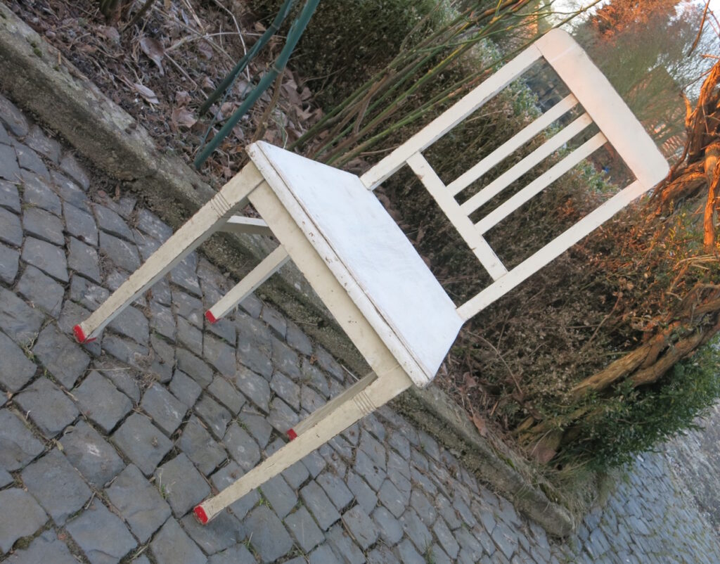 Sonniger Tag, nach dem Mittag ein Wärmeschub. Ich sah zum Hahn hinauf, der aber bei Nordost verharrte. Innenlager von zwei Rädern umgebaut. Einen gestern aufgegriffenen Holzstuhl gewaschen und geschmirgelt. Ein gewöhnliches Modell mit sanft geschwungenen Beinen, drei senkrechten Streben an der Lehne, klassisch verleimt. Wunderbar, sich durch Lackschichten und Altersringe zu arbeiten. Ganz behutsam. Das Holz duftet nach Schwamm und Schmirgel und trocknet in der Sonne durch. Morgen kommt eine dünne Schicht weißer Lack drauf. Deutsche Gebrauchsmöbel, circa achtzig bis hundert Jahre alt. Darauf hoffen, dass eine neue Generation sich dafür interessiert.