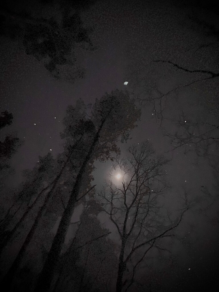 Die Nacht hat noch Restfrühlingswärme. Ist klar. Schatten schön scharf, nur an den Rändern etwas verlaufend oder liegts an meinen Augen? Was Emma wohl sehen mag? Jedenfalls scheint ihr das Licht zu gefallen. Unermüdlich tippeln ihre kleinen Füßchen auf dem Weg. Es raschelt im Laub. Emma wackelt dahin, die Nase am Waldboden. Rascheln entfernt sich. Vom alte-Männer-Schniefgestöhn her, würd ich sagen, war es n früher Igel, aber der fängt ja bekanntlich die späte Beute, heute. Es ist so trocken hier, dass es beinahe schon staubt. Langsam wirds kühl. Ich rauche und labe mich an der Stille. Ein einzelnes Feierfeuerwerk rumst in der Ferne, ein Hund beschwert sich. Emma spurt ruhig auf ihrer Umlaufbahn und 1, 2mal ist ihr ne Marke ne Erwiderung wert.