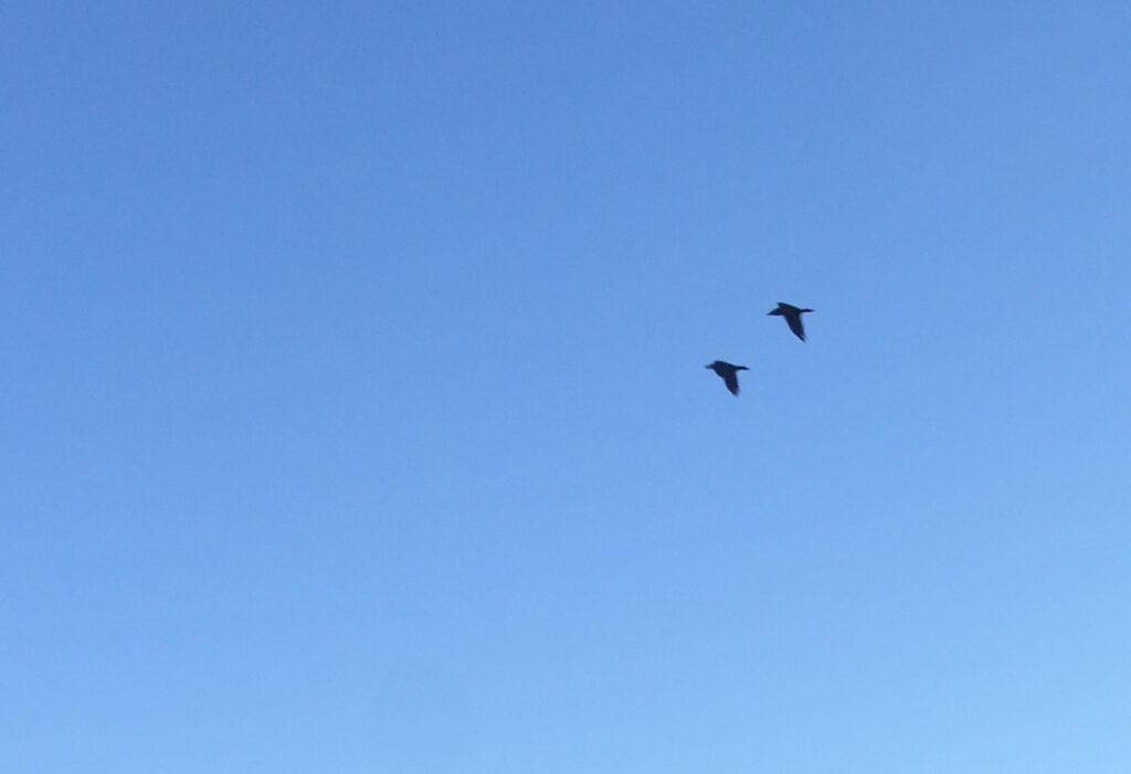 Sonniger Morgen – Flutlicht! Tauben auf den Wipfeln in Stereo, nur ganz sanfter Nordwest, die Rauchsäulen über den Schornsteinchen sind kaum aus der Ruhe zu bringen.