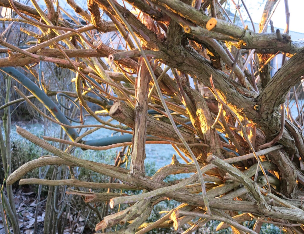 Vereister, strahlender Morgen, die Sonne kriecht schräg ins Holz. Der Zaunkönig unterwegs auf Zaunlatten und lässt mich zusehen - ich darf gerade noch die Teetasse zum Mund führen. Bald wird sein lautes Zwitschern die Amseln übertönen. Die Strahlen erreichen den Rennradsattel und befreien ihn vom Reif. Als Mitglied des Teams Pausenbrote seh ich dem Sohn nach, wie er mit dem roten Rucksack zum Bus läuft. Im Dorf hat im letzten Winter ein Wolfsrudel ein paar Strauße gerissen, danach wurden überall Zäune verstärkt (den Rest dürfte jagdliche Selbstjustiz erledigt haben).