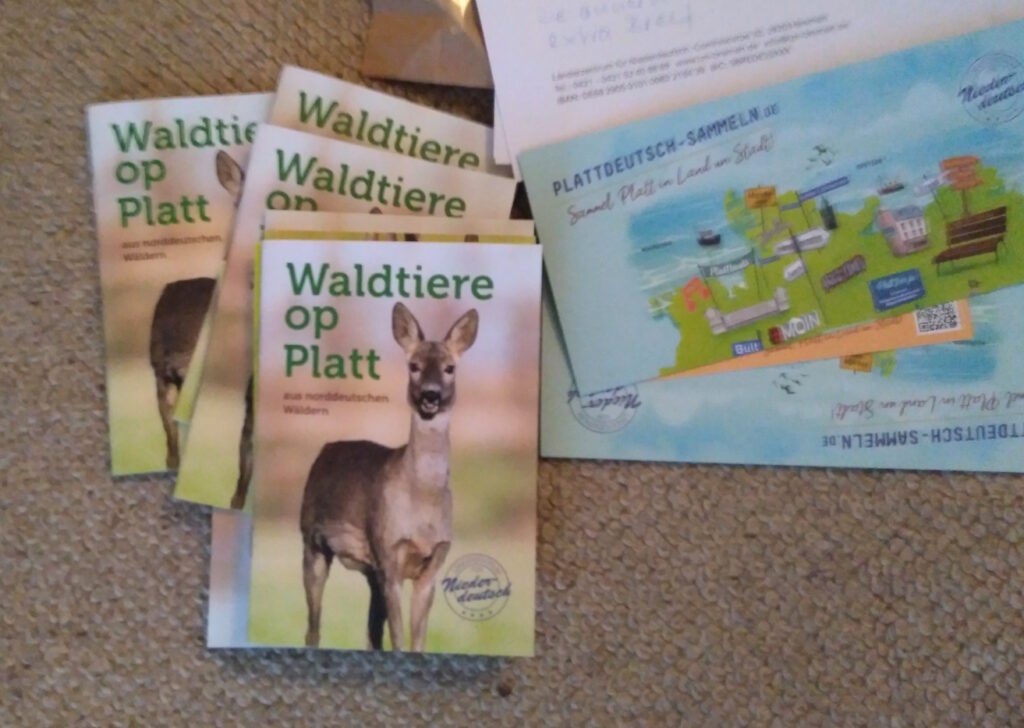 Zwei Briefe vom Länderzentrum für Niederdeutsch aus Bremen in der Post, sehr nett und, logo: op Plattdütsch. Beiliegend Exemplare des Büchleins „Waldtiere op Platt“, das dort in Zusammenarbeit mit einem Waldpädagogikzentrum herausgegeben wurde. Voss, Haas, Aadboor und Muulworp in der Sprache meiner Mutter und deren Mutter sind mir noch vetraut (dito Swienegel als Schimpfwort), andere wie Stummelsteertmoort oder Holtuul neu für mich, auch wenn man viel erschließen kann (Holtuul = Holzeule = Waldkauz). Die Erwachsenen auf dem Volkseigenen Gut, wo Oma und Opa lebten, sprachen allesamt Platt. Das lernte wir Kinder nebenher zu verstehen, Hochdeutsch sprach da niemand mit uns.