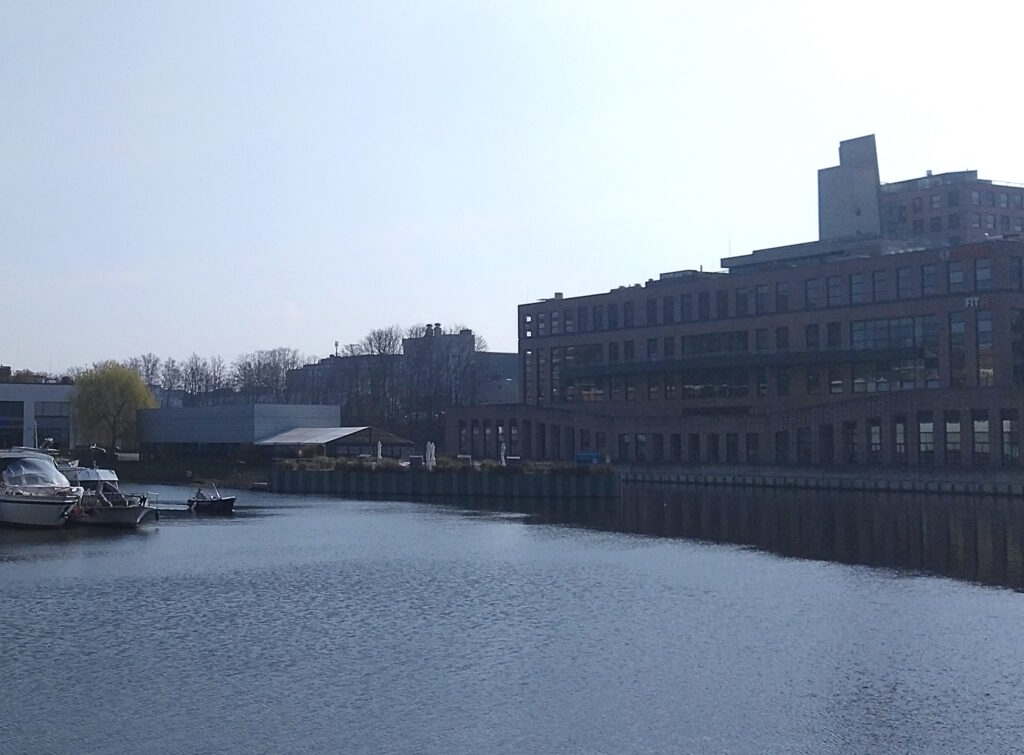 Wenn man wie ich, nicht nur auf einer Insel , sondern zudem nur ein paar hundert Meter vom größten Hafen Berlins entfernt lebt, freut man sich immer, wenn es einen auch mal zu einem der anderen 23 Binnenhäfen führt – so wie mich justament zu jenem in Tempelhof. Dieser wurde 1901-1908 erbaut, Zentrum des Umschlagsplatzes war der Speicher, in dem 14.000 Tonnen Getreide, Stückgut und anderes eingelagert werden konnten. Die Löschung erfolgte durch vier kleine Kräne sowie das Becherwerk für das Schüttgut. Über Schienen, Lastenaufzüge und Bandanlagen wurden die Waren in das Gebäude und dort dann an den jeweiligen Platz gebracht. Prunkstück war das technisch raffinierte Getreideverteilungssystem: Becherwerke hoben das Korn in Schüttgutbehältern über Förderketten in die vierte Etage, von wo es auf eine Waage im dritten Geschoss fiel. Von dort kam es über eine Reinigungsmaschine in den zweiten Stock, um hernach durch Fallrohre in den Keller zu gelangen. Aus diesem wurde es nun mit den Hauptbecherwerken wieder unter das Dach gebracht, wo es durch Trichter auf die Bandanlagen gelangte, die schlussendlich die horizontale Verteilung in der Lagerfläche besorgten.