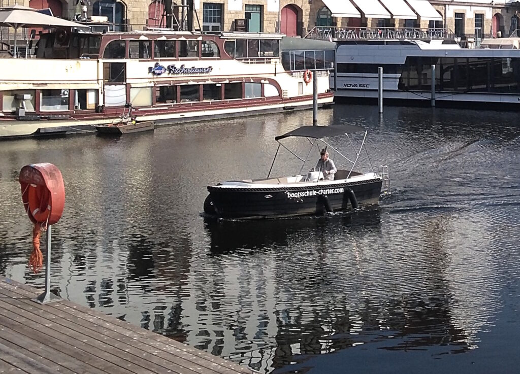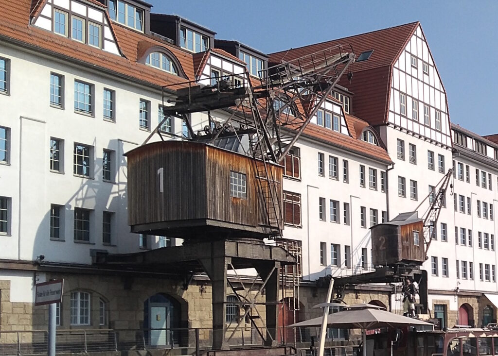 Der Speicher blieb dann bis auf kleinere Zwischennutzungen leer. 2007 erhielt eine Investorengruppe die Genehmigung, auf dem Gelände ein riesiges Einkaufszentrum zu errichten – Bedingung für die Neunutzung war, das Bild des alten Hafens zu erhalten, infolge dessen man den Speicher saniert und technische Anlagen wie die Kräne restauriert und rekonstruiert hat. Das gesamte Ensemble steht inzwischen unter Denkmalschutz und wurde meiner Meinung nach mit Augenmaß in die Neuzeit überführt, wobei ich anmerken muss, dass ich lediglich am Hafenbecken entlangschlenderte, mir eine Inneninspektion der Shoppingmall jedoch ersparte. Ich bin ja mehr so der Giebel-, Kran-, Poller-, Bootebekieker … so geschehen unter blauem Himmel, bei prima Sonnenschein, aber kühl anmutenden 14°, frühblüherumschmeichelt, mit einer Vogelwelt auf der Balzkirmes.