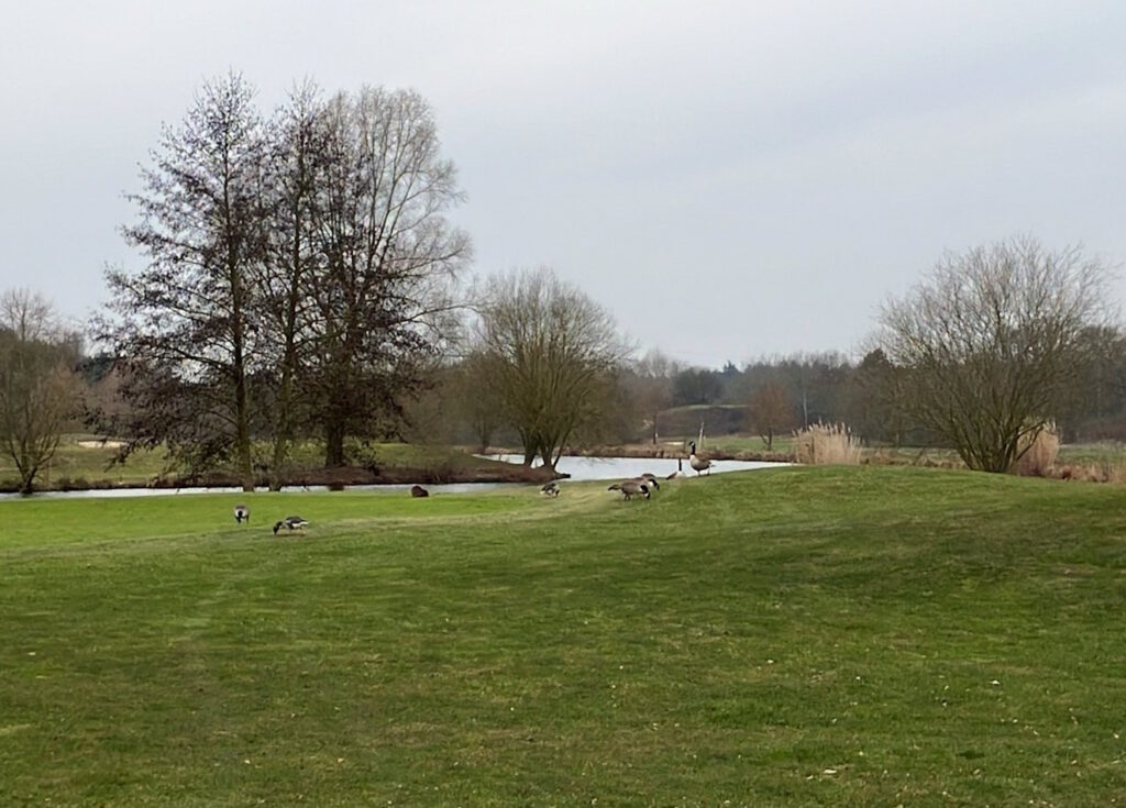 Meist bin ich für drei, vier Stunden hier – hier, das ist der Golfplatz in Adendorf. Kooperationsparter vom NABU, der Allianz für Wildbienen und der Deutschen Wildtierstiftung. (Die Mitgliedschaft kostet mich pro Jahr übrigens weniger als die Musikschule für unsere Tochter -oder manch Dauerkarte für die Fußball- und Eishockeybundesliga …)
