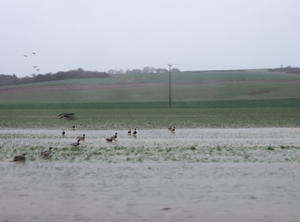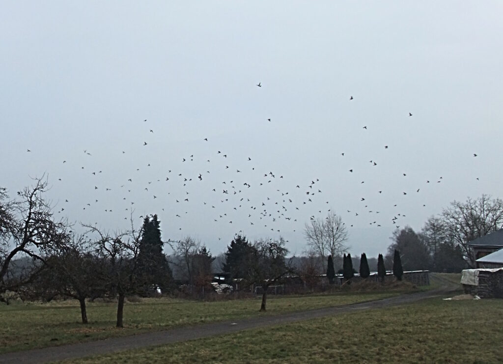 Schauriges Wetter, muss gut über meine Montur nachdenken. Mit geflicktem Schlauch und neu aufgezogenen Reifen aufs Rad – die Winterstiefel sind vom Samstagsritt getrocknet. Sehe auf dem Feld eine Gruppe Elstern. Rabenvögel sind Aasfresser, nur widerwillig lassen sie vom Rehkadaver.