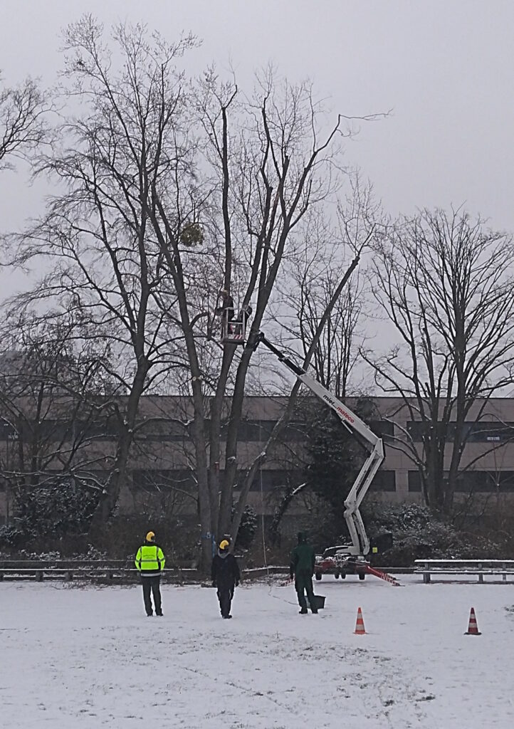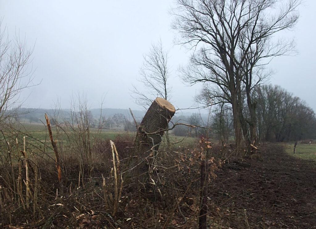 Der Fäller, ein fünfzigjähriger, gutgelaunter Mann, kletterte mit einer Behändigkeit, die mich sofort fröhlich machte, ohne Hilfsmittel den Stamm hoch, schmiss oben die Motorkettensäge an (wobei sein Ast beachtlich schwankte) und sägte Ast für Ast den Baum herunter, bis alles weg war. Das dauerte keine Stunde. Ganz kundig gelang es ihm in unglaublicher Geschwindigkeit zu erfassen, wie er es anstellen muss, dass keiner der Äste in die Fenster des zweistöckigen Hauses fällt oder Dachrinne und Zaun zerschlägt. Wir räumten die Äste und Stammenden weg und bargen alles bis zu halber Unterarmstärke als Brennholz für meine Öfen – ein halbes Jahrhundert Wachstum in einem Auto mit Hänger. Davon habe ich ungefähr zwei Wochen eine warme Werkstatt und Küche, die ja auch mein Wohnzimmer und Büro ist.