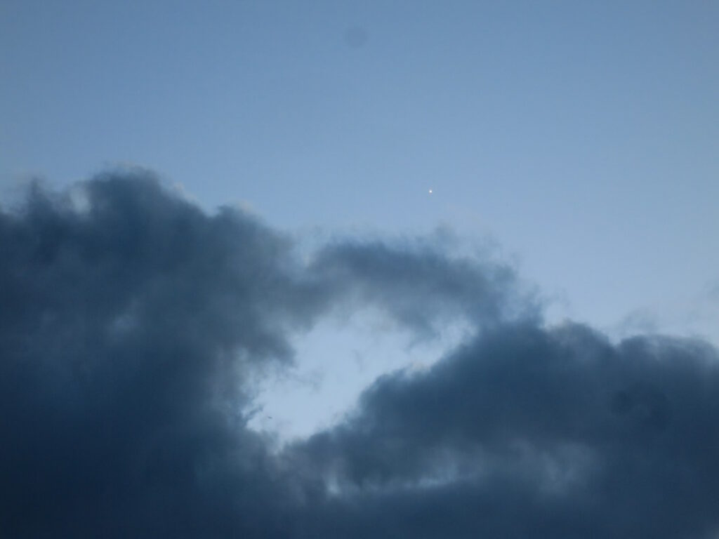 MERKUR GESICHTET. 18h40 ziemlich genau West, eine Handbreit über dem Horizont. Ganz schwaches Funkeln. Winzig im Vergleich zur fußballgroßen, maximal sichtbaren Venus, die ein Stück höher (so 40 Grad über Null) süwestlich strahlt. Nun abwarten, ob sich noch eine Lücke auftut, bevor die echten Sterne aufs Tapet kommen.