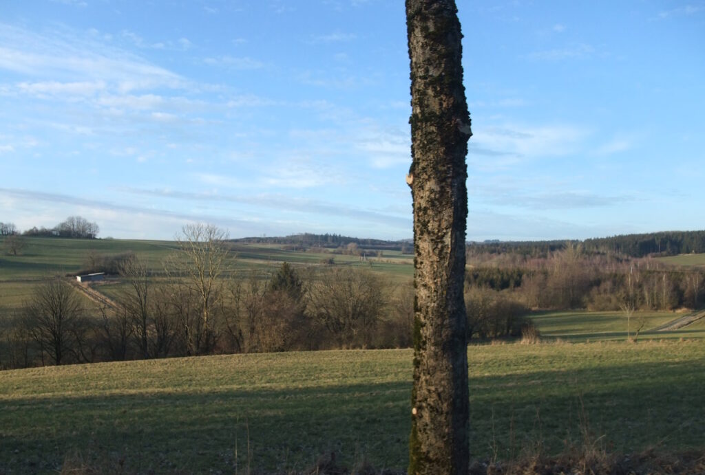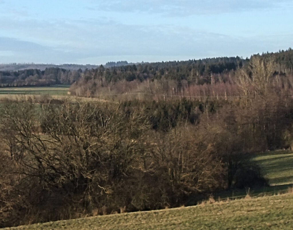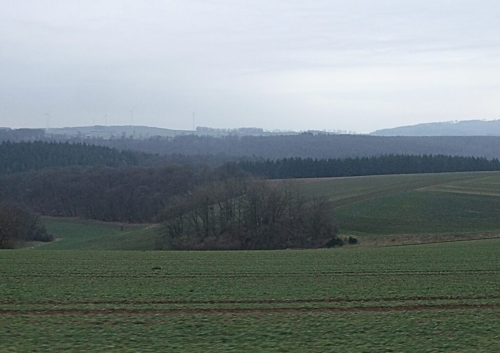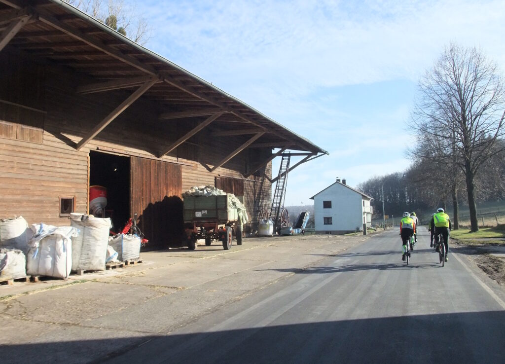 Der Morgen erzeugt ein zartes Blau mit einer hohen Wolkendecke und Temperaturen um die null Grad. Die Bilder und Ortschaften der Fahrt vom Samstag sickern immer noch nach. Mit dem Rad begreift man Distanzen ganz anders, was sehr deutlich wird, wenn es durch die dünn besiedelte Ostseite des Vogelsbergs geht. Ein Dorfladen ist dort ein infrastruktureller Glücksfall. Die Ackerstücke, meist Weiden, sind riesig. Anders als zwischen Marburg und dem Westerwald sieht man kaum Pferdehöfe oder üppige Reithallen. Es ist Agrarland in Erwartung des Frühlings. Es ist Hinterland, das einst fest im Griff des Bischofs von Fulda war – mit stattlichem Schloss in Stockhausen. Ab 1949 nannte man so etwas strukturkonservativ. Bei unserer Tour große Stille auf den Feldern und in den Dörfern. Selten ein Gasthof, selten Menschen. Keine Dönerläden oder „italienische“ Pizza. Der Vulkanradweg ist die umgewidmete Bahnstrecke zwischen Frankfurt und Fulda – im Sommer soll hier ein munteres Treiben sein.