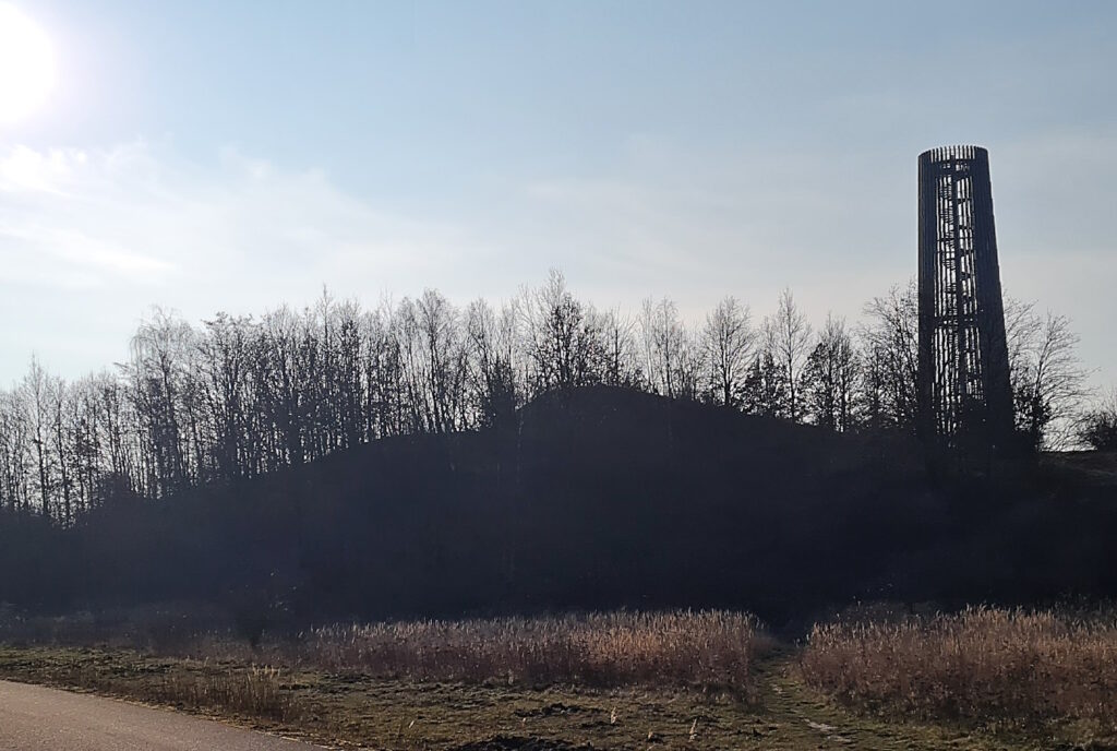 Bis zur Bistumshöhe, genau genommen bis unmittelbar vor dem Abzweig, brauche ich etwa 45 Minuten. Die Anhöhe liegt zwischen dem Cospudener und dem Zwenkauer See. Sie ist 131 Meter hoch und wird von einem Aussichtsturm gekrönt. Ich sehe den Turm zunächst als Schemen gegen die tiefstehende Sonne und dann, als ich vorbei bin und mich umdrehe, leuchtend im Sonnenlicht. Möwen kreischen, eine Krähe kräht, Spatzen zanken, ein Hund bellt. Im nahegelegenen Gehege haben es sich Alpakas gemütlich gemacht und kauen kauernd vor sich hin.