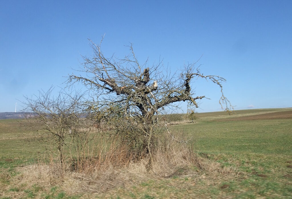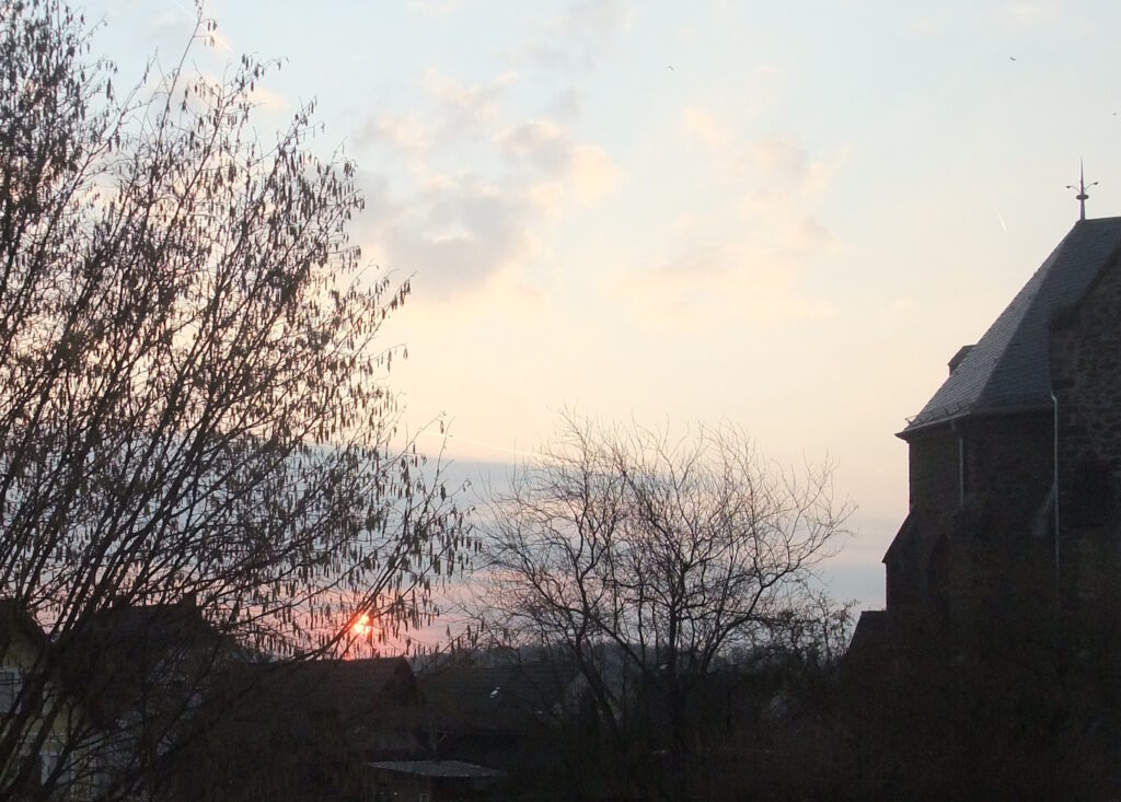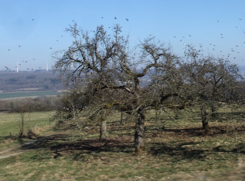 Später habe ich unsere Apfelbäume beschnitten: Alle Dornen raus und einen weiteren Parasiten beseitigt, der schlank neben der Krone emporwuchs. So nicht! Erste Balzflüge gesichtet, vermutlich Finken. Die große Uhr lässt sich nicht beirren. Der Storch ist in der Wetterau inzwischen Standvogel. Mit der Serenade von Josef Suk wird nun langsam die Abendstimmung eingefangen.