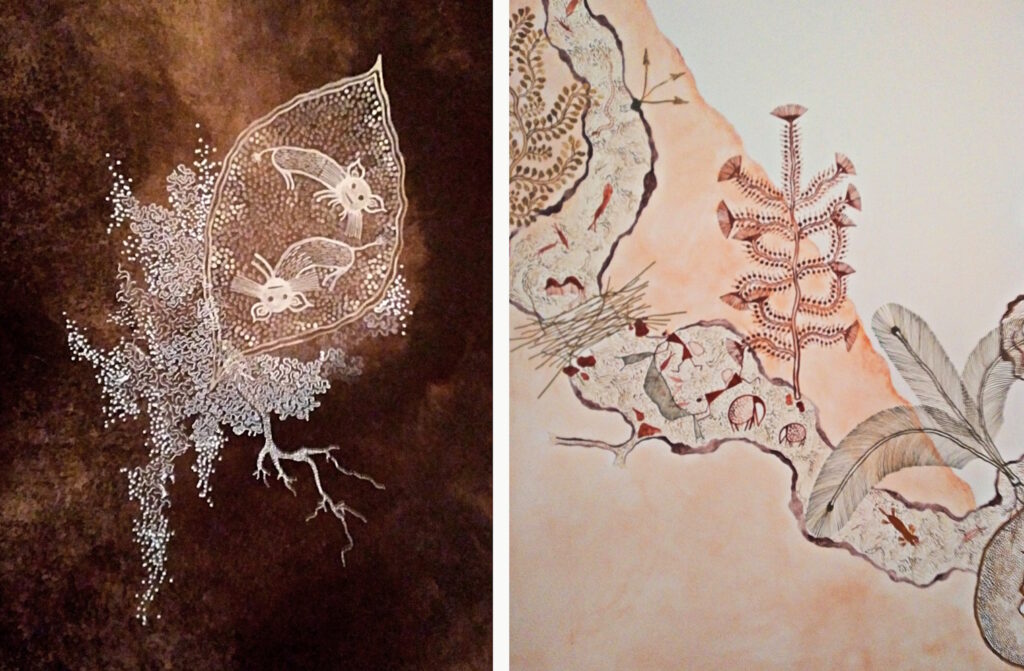 Die in der Ausstellung gezeigten Malereien, Zeichnungen, Texte und Skulpturen beeindrucken durch ihre außergewöhnliche Bildsprache, die Farben und Formen. Man spürt, dass diese Werke in einer sehr langen Traditionslinie stehen – geerdet, heimatverwurzelt, all die Geister der Vorfahren anrufend. Das hat glücklicherweise überhaupt nichts mit Ethnokitsch zu tun und ist auch keine dieser momentan inflationär zu sehenden „Ökokunst“, der man leider meist anmerkt, dass sie nur geschaffen wurde, weil es dafür gerade einen Markt oder ein Feld im Fördergeldantragsformular gibt – das hier ist Kunst, die Bestand haben wird, weil sie sich mit den Jahrhunderten vor ihr verbindet und nicht mit dem Zeitgeist.
