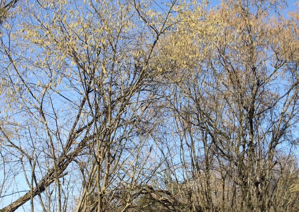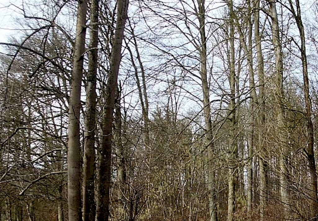 Kurz nach 11 Uhr auf dem Rad den Berg hinauf, Besorgungen für die hungrige Mittagsbande machen. Auf einer Nebenstraße beobachte ich Rückbezüge, die abgeschälte Buchenstämme in holländisch-belgische Sattelschlepper mit Containerauflieger verladen. Drei Stunden später sind die Stämme im Hafen von Antwerpen, von dort geht es in die große weite Welt. Für mich heute nur die kurze Runde, morgen steht ein 200-km-Ausflug zum Hoherodskopf an, das ist der Gipfel des Vogelsbergmassivs, nordöstlich von Frankfurt. Windig und grau bei böigem Ostwind. Die Weiden bilden erste Kätzchen.