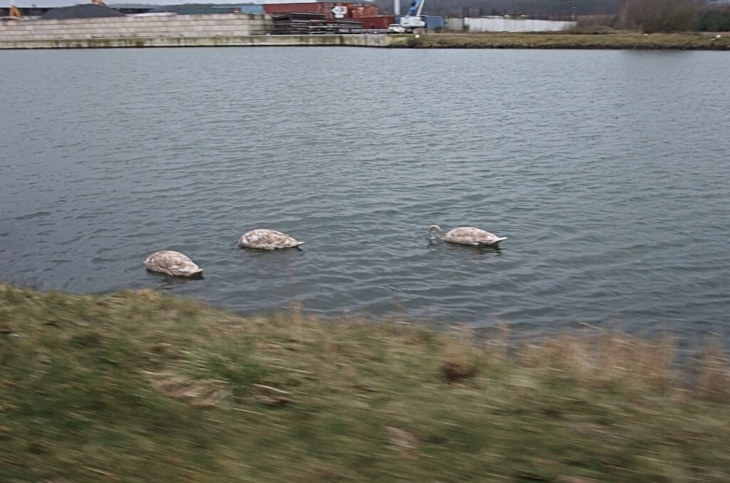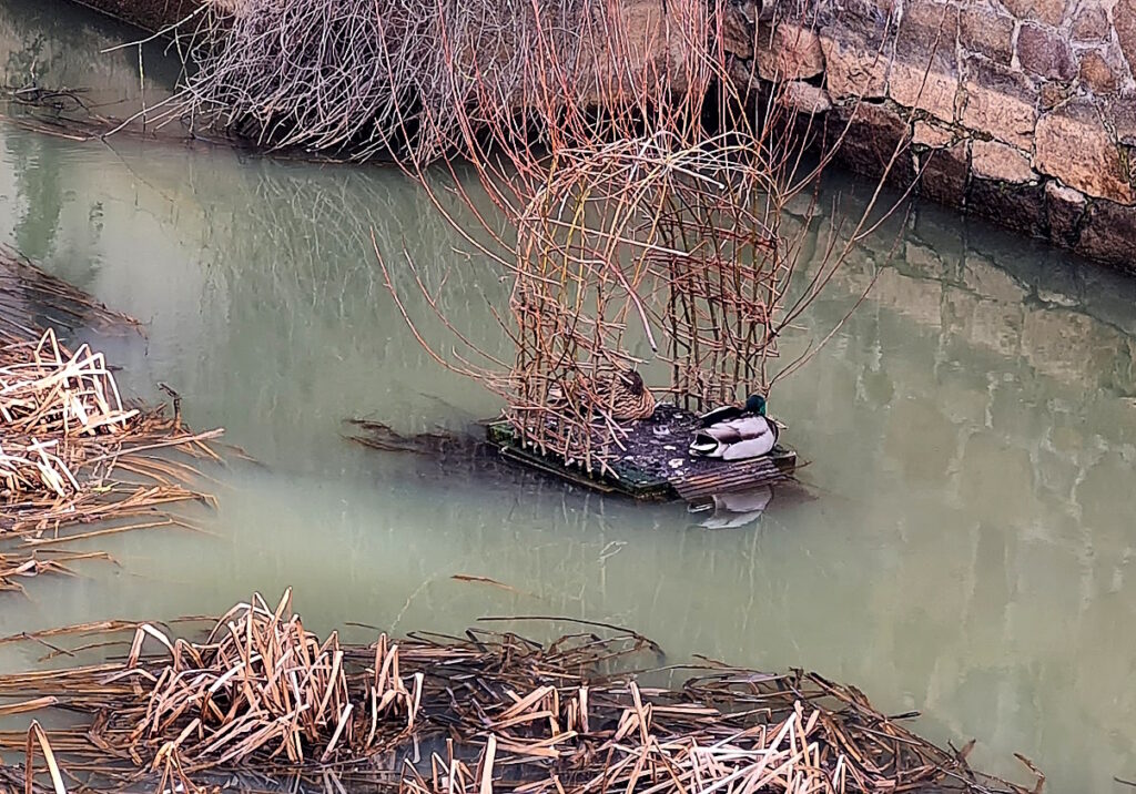 Nun, das Entenpärchen stört es nicht – kann es nicht unter den Straßen hindurchschwimmen, kann es immer noch drüber weg fliegen. Oder bleibt einfach liegen und lässt sich von der Sonne wärmen, die mittags direkt auf die Flechtpergola scheint.