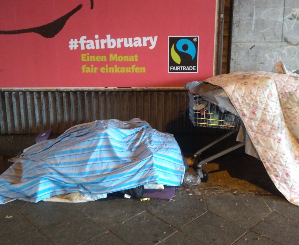 Sonntagsspaziergang. Treffe im Kleinen Tiergarten eine Nachbarin, die mit ihren beiden Enkelinnen unterwegs ist. Sie berichtet, dass sie vorgestern im Volkspark Friedrichshain die ersten aufgegangenen Schneeglöckchen gesichtet hat, daneben viele Winterlinge. Bei uns in Moabit noch nüscht dergleichen. Aber eine wärmende Sonne und ein blauer Himmel! Nette Verabschiedung. Und weiter. Im Großen Tiergarten sitzt ein Graureiher auf einem Ast und blickt über seinen Tümpelrand. Im Neuen See entdecke ich zwischen Stockenten und Blässhühnern erstmalig eine Mandarinente – die kenne ich bislang nur vom Schlachtensee und neuerdings vom Spreeufer neben dem Schloss Bellevue. Willkommen! Im Café am Bootsverleih bollern die Holzöfen und Eisstöcke und bei einigen der Schützen wohl auch ein paar Tassen Glühwein durch die Blutbahn – Volksvergnügen wie vor einhundert Jahren. Am Landwehrkanal gehen Grüße an Rosa und Karl raus. Unter der S-Bahnbrücke wird hinter den Pennplätzen der Obdachlosen ein „Fairbruary“ beworben. An der Suppenausgabe der Bahnhofsmission Zoo sehe ich in zwanzig Sekunden mehr kaputte Venen als ein Phlebologe im Quartal. Aus einem Ghettoblaster kommt ein 90er-Jahre-Eurodiscohit, ein paar Süchtige brummeln mit, zwei schreien und fangen plötzlich zu schluchzen an.